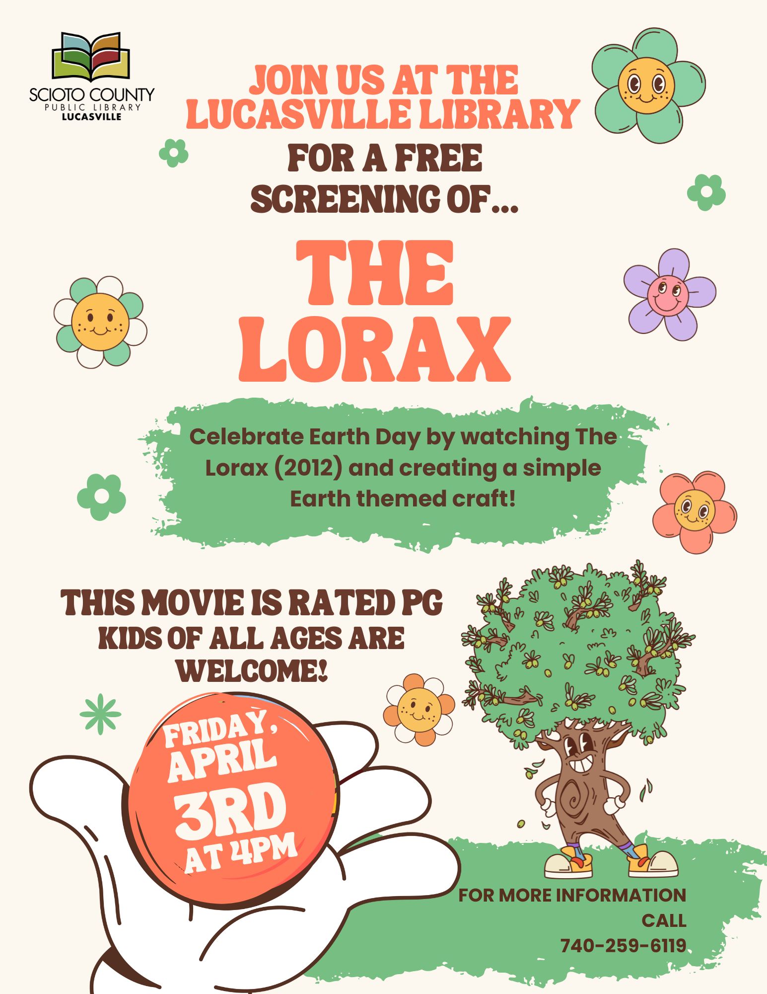 Children are invited to join us at the Lucasville Library on Friday, April 3rd at 4pm for a free viewing of The Lorax (2012). During the movie, children will have the opportunity to craft the earth from a paper plate, crayons, and paper. For more information, call 740-259-6119.