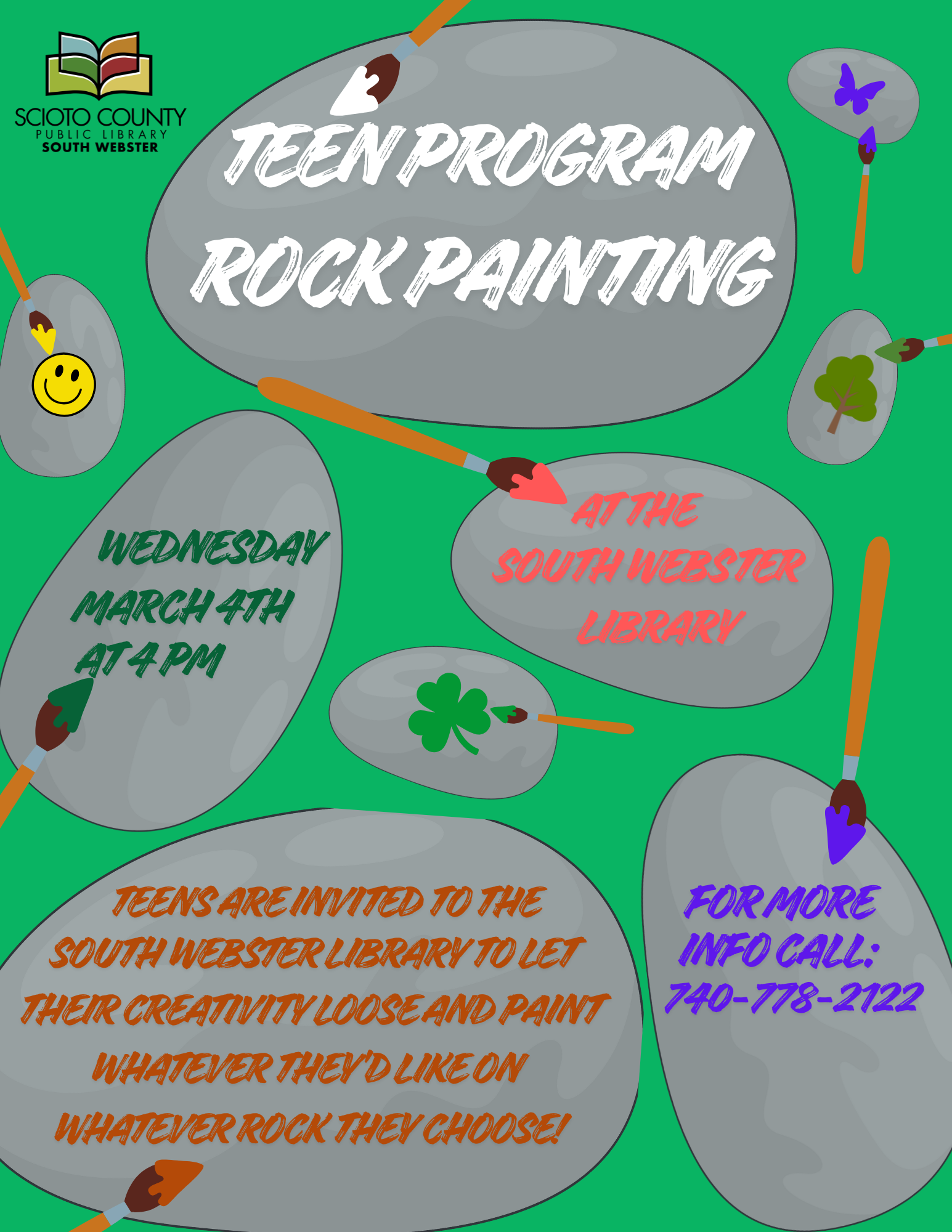 Rock Painting. At 4 pm teens are invited to the South Webster Library to let their creativity loose and paint whatever they’d like on whatever rock they choose! All materials needed will be provided.