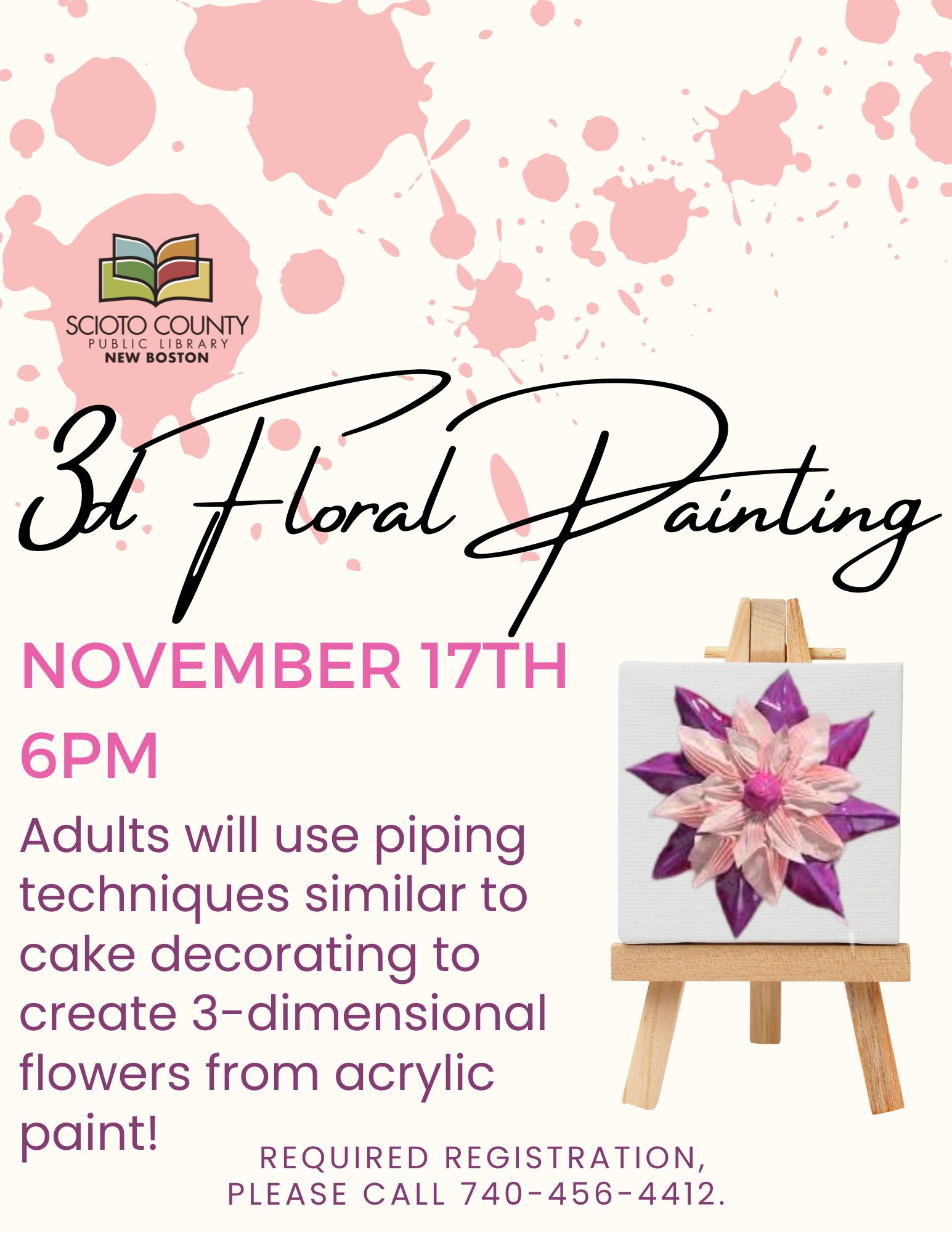 Join us at the New Boston Library to make a 3D Floral Painting. You’ll use piping techniques similar to cake decorating to create 3-dimensional flowers from acrylic paint. To register, please call 740-456-4412.