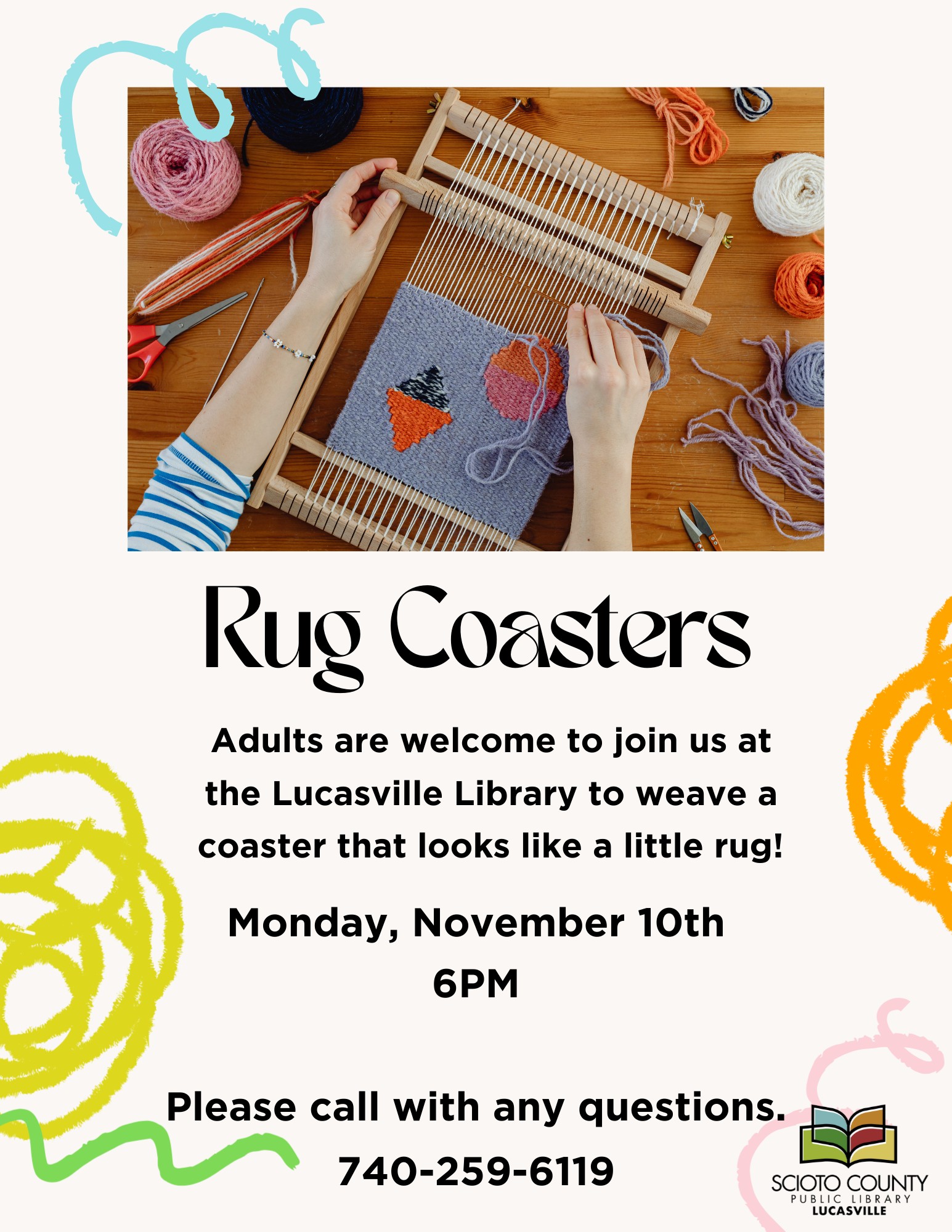 Adults are welcome to join us at the Lucasville Library on Monday, November 10th at 6pm for a coaster craft activity. We will be weaving yarn to create decorative rug coasters. This is a great project for beginner weavers! For more information, please call 740-259-6119.