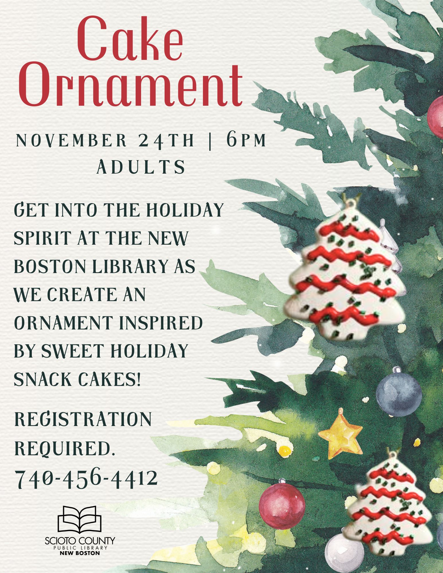 Adults are invited to get into the holiday spirit at the New Boston Library as we create an ornament inspired by sweet holiday snack cakes. To register for this program, please call 740-456-4412.