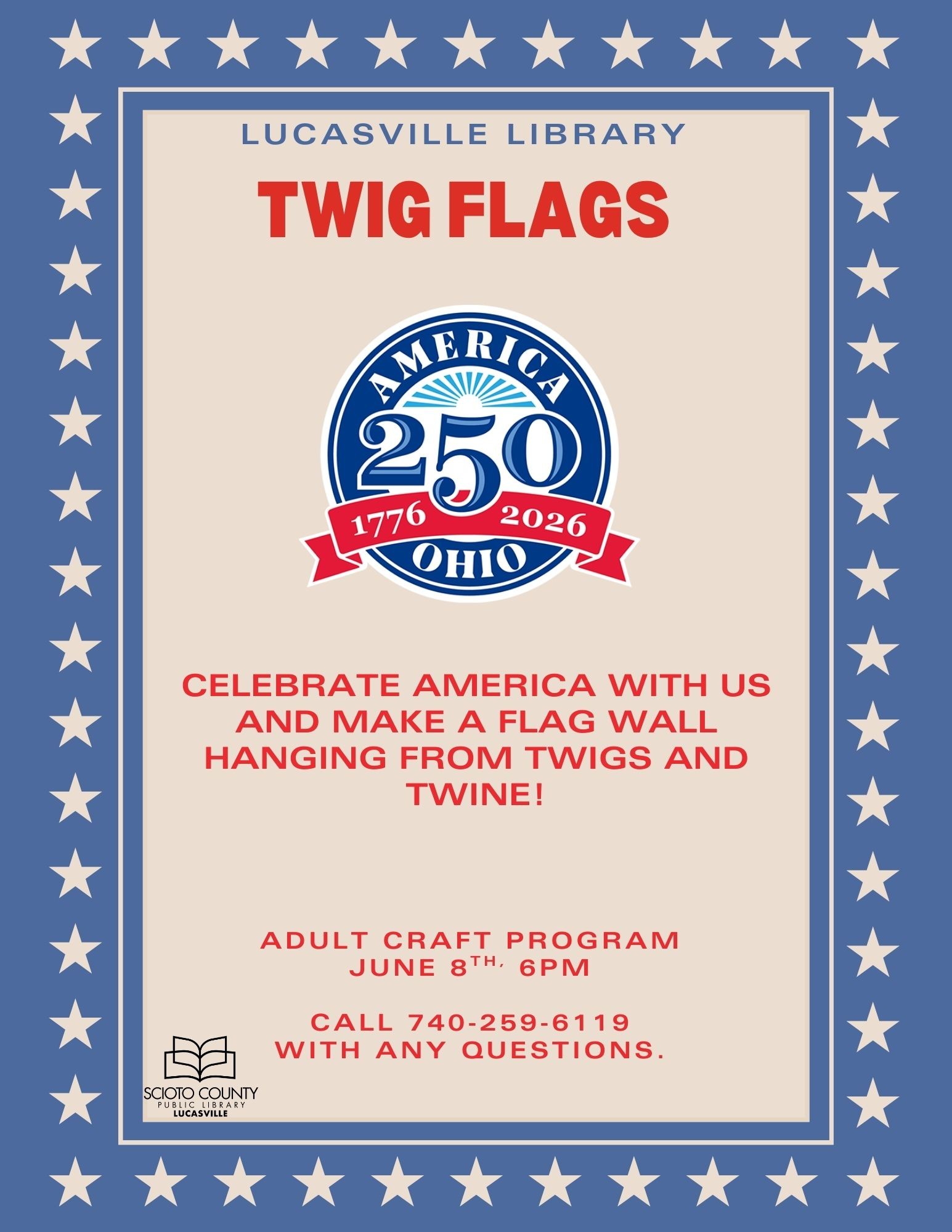 Adults are welcome to join us at the Lucasville Library as we celebrate America 250 and make Patriotic Twig Flags. This craft activity will be on Monday, June 8th at 6pm and we will be using red, white, and blue painted twigs to create a flag that resembles the American...
