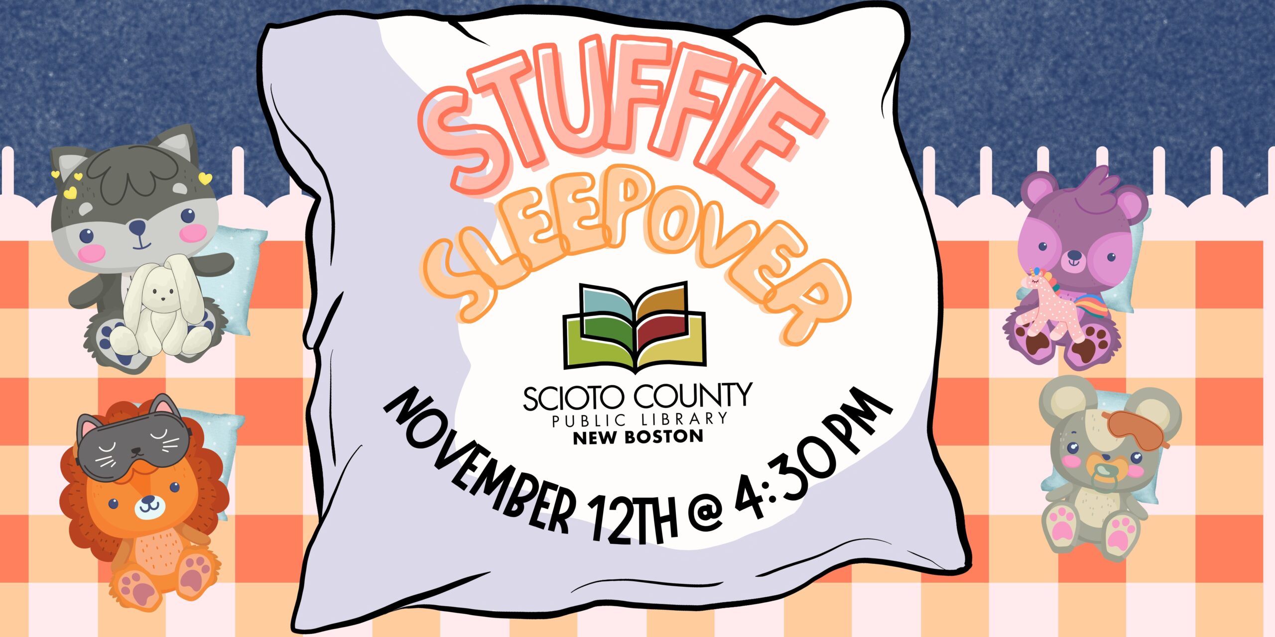 Prepare your stuffed animal for their library sleepover! Please share a little about your stuffed animal and introduce them to some new friends. You’ll have the chance to create a nametag, choose a bedtime story, and pick them up the next day. For more information, please call 740-456-4412.
