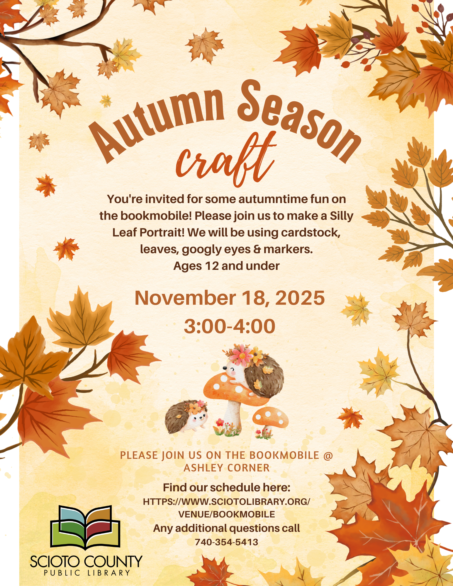 You're invited for some autumntime fun on the bookmobile! Please join us at Ashley Corner to make a silly leaf portrait! We will supply all art materials and is for ages 12 and under.