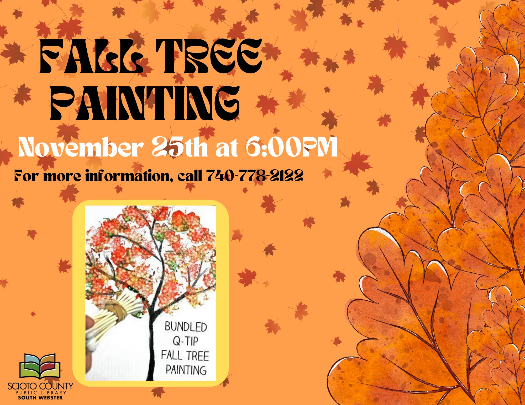 Leaves are falling, autumn is calling! Join us at the South Webster Library to make your very own Fall Canvas Painting. All supplies provided. For more information, call the South Webster Branch Library at 740-778-2122.