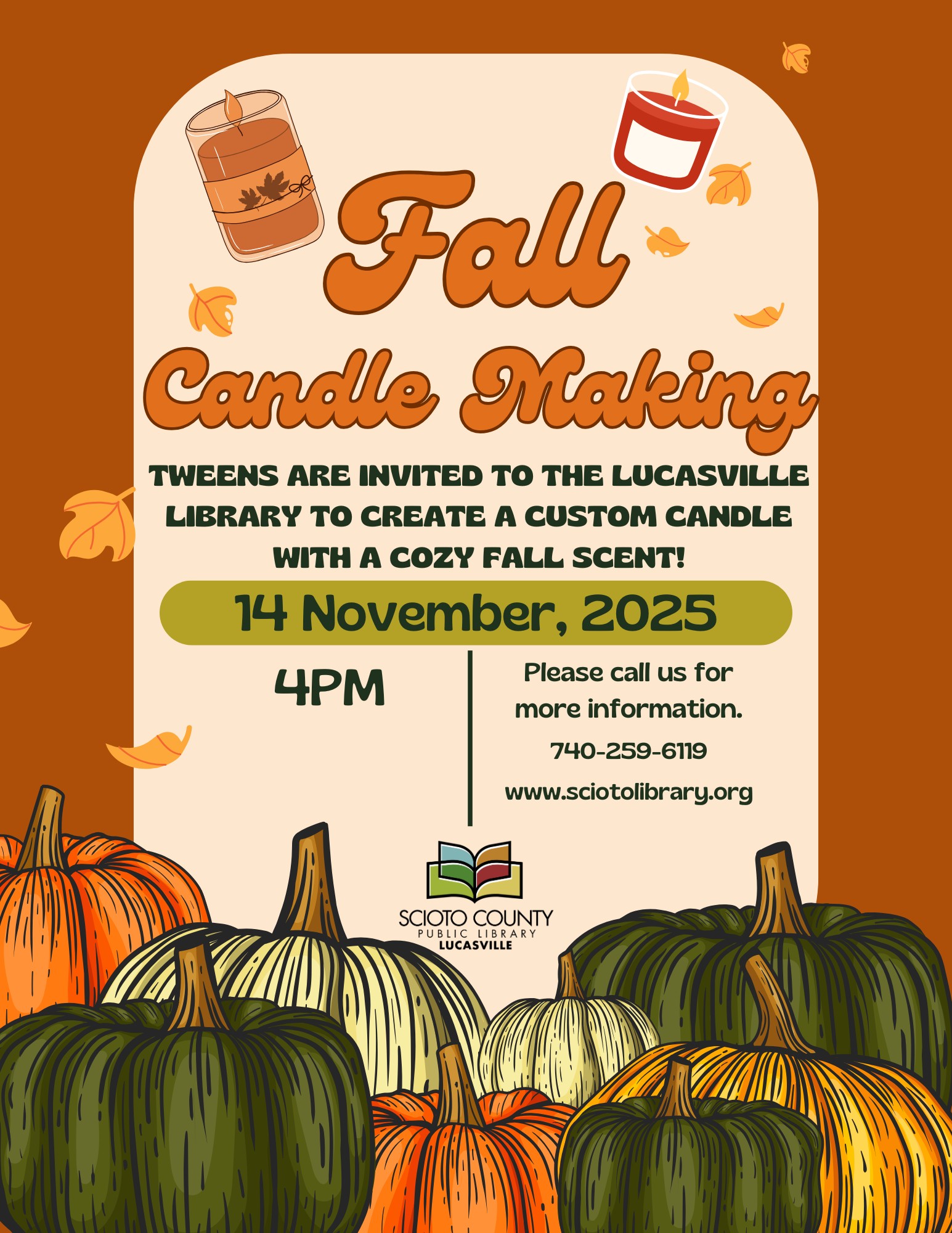 Tweens are invited to celebrate the autumn season at the Lucasville Library with candle-making! Make your own custom-scented candle with delicious fall scents – perfect for a cozy night in, curled up with a library book. This program will take place on Friday, November 14th at 4pm. For more information,...