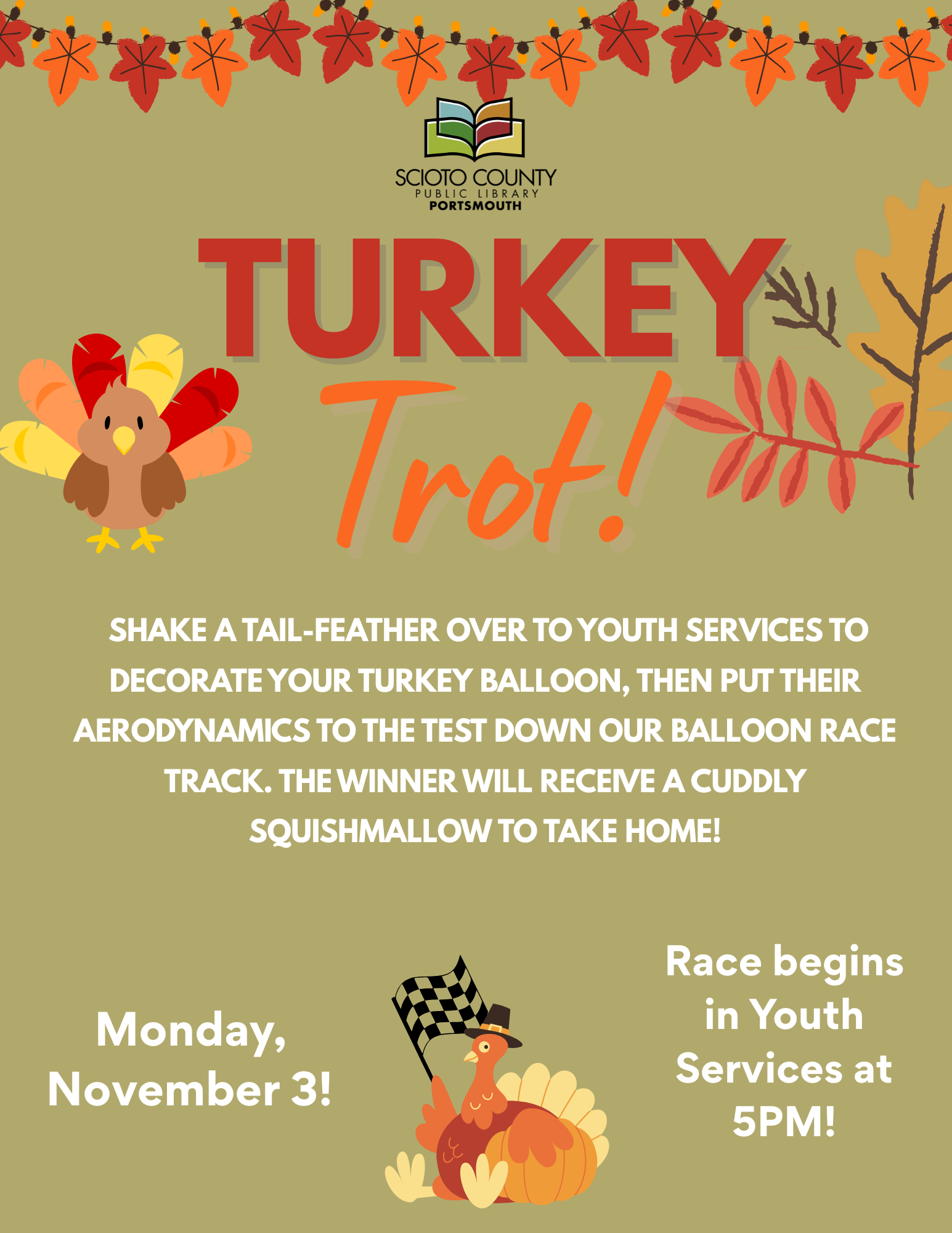 Shake a tail-feather over to Youth Services to decorate your turkey balloon, then put their aerodynamics to the test down our balloon race track. The winner will receive a cuddly Squishmallow to take home!