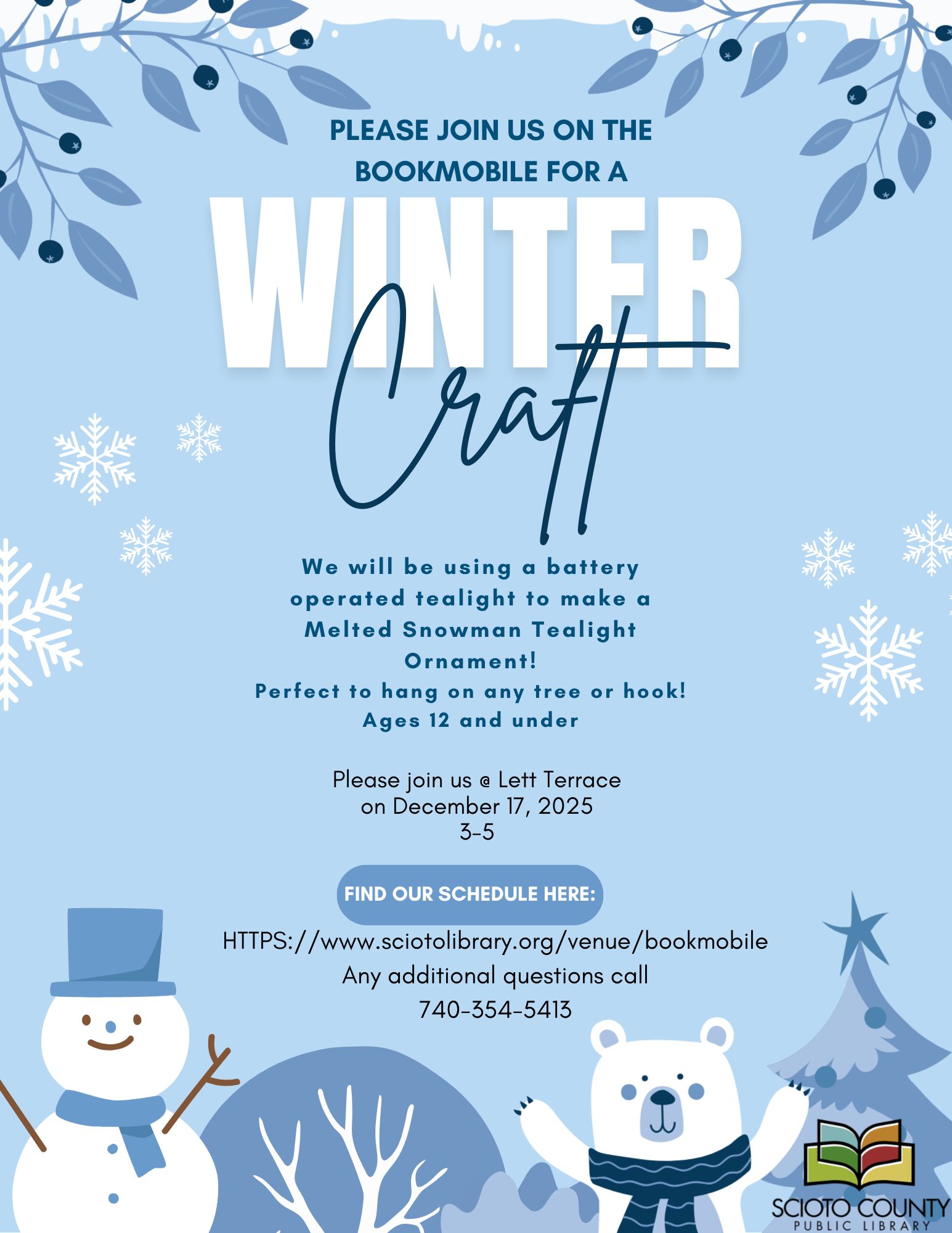 Please join us on the bookmobile at Lett Terrace for a winter craft! We will be using a battery operated tealight to make a melted snowman tealight ornament! Perfect to hang on any tree or hook. We supply all art materials and is for ages 12 and under.
