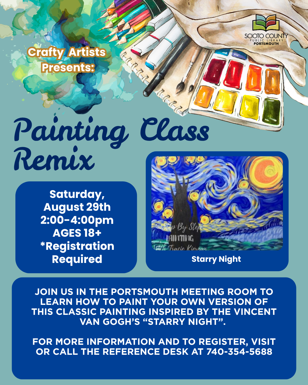 Portsmouth Public Library 1220 Gallia Street, Portsmouth, OH, United StatesIf you missed this month's adult painting class here is your second chance! Join us in the meeting room to create your own version of the classic painting "Starry Night". Registration is required and all supplies will be provided.
