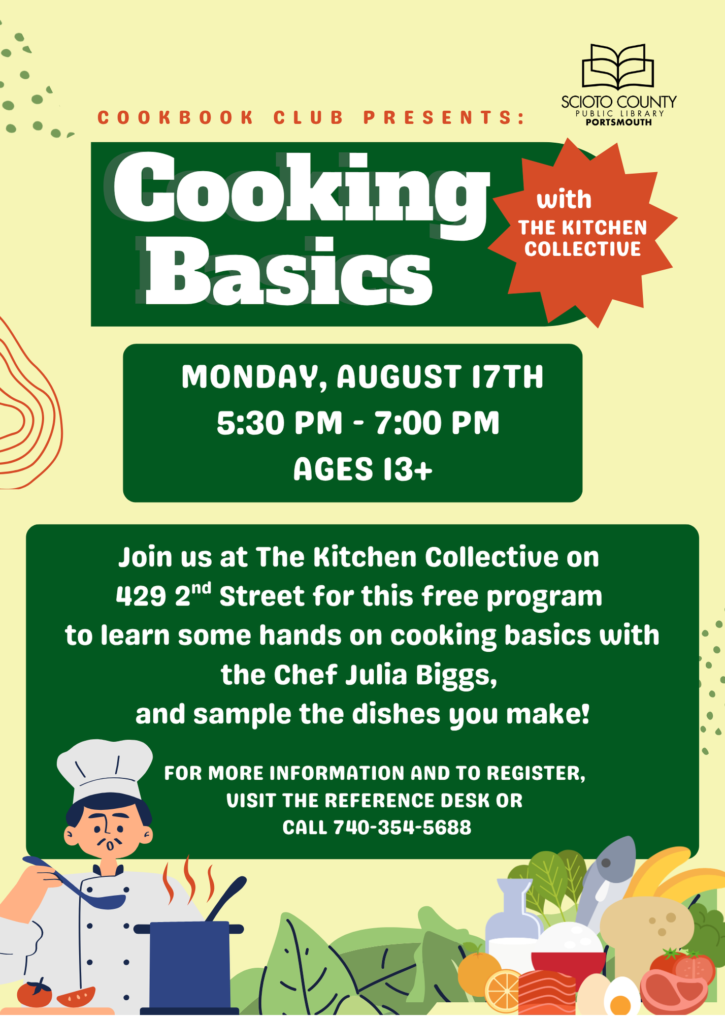 Join us at Kitchen Collective with Chef Julia Biggs at 5:30pm to learn some hands on cooking basics and sample what you make. Registration is required. Ages 18+