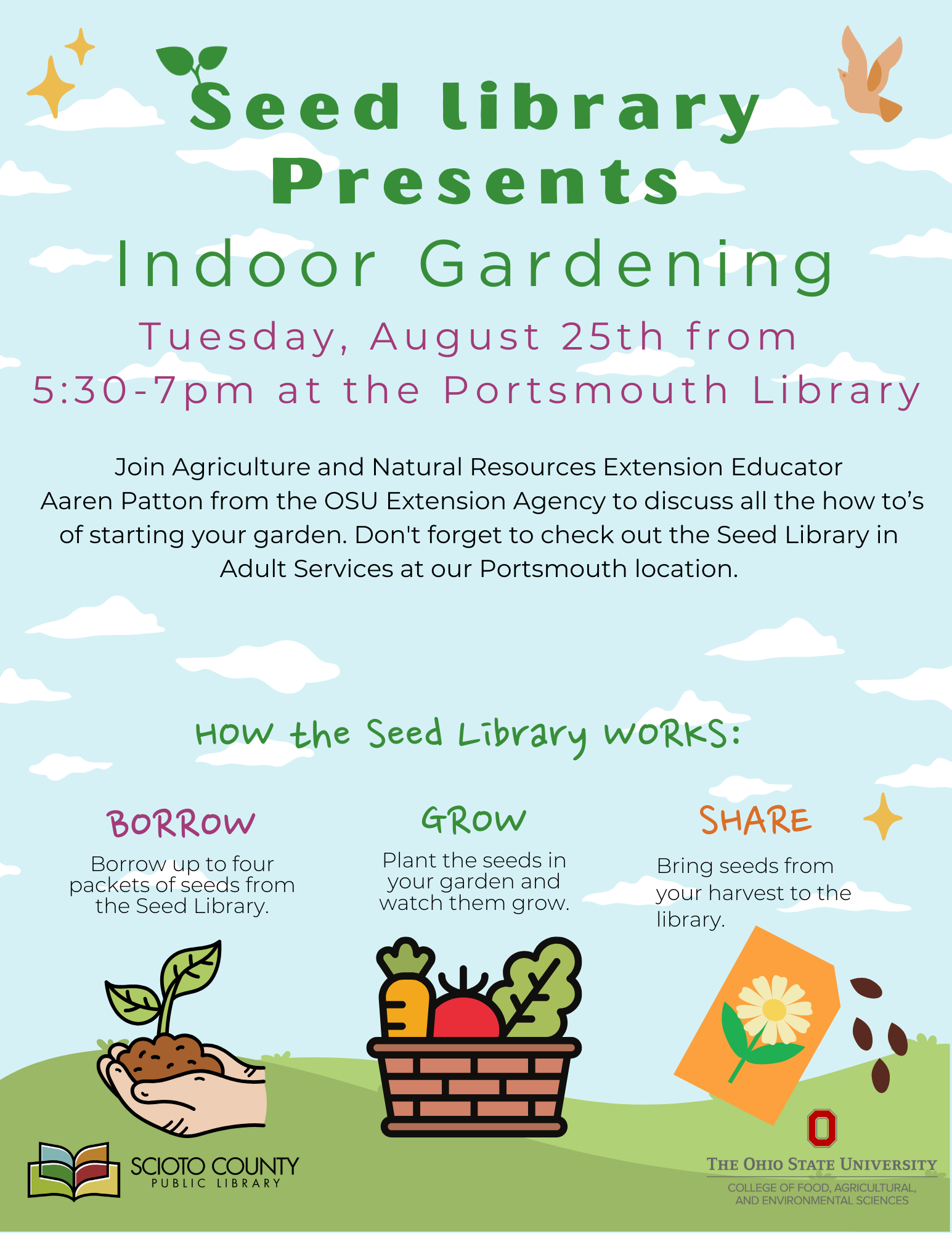 Portsmouth Public Library 1220 Gallia Street, Portsmouth, OH, United StatesJoin Agriculture and Natural Resources Extension Educator Aaren Patton from the OSU Extension Agency to discuss all the how to’s of starting your garden. Don’t forget to check out the Seed Library in Adult Services at our Portsmouth location.