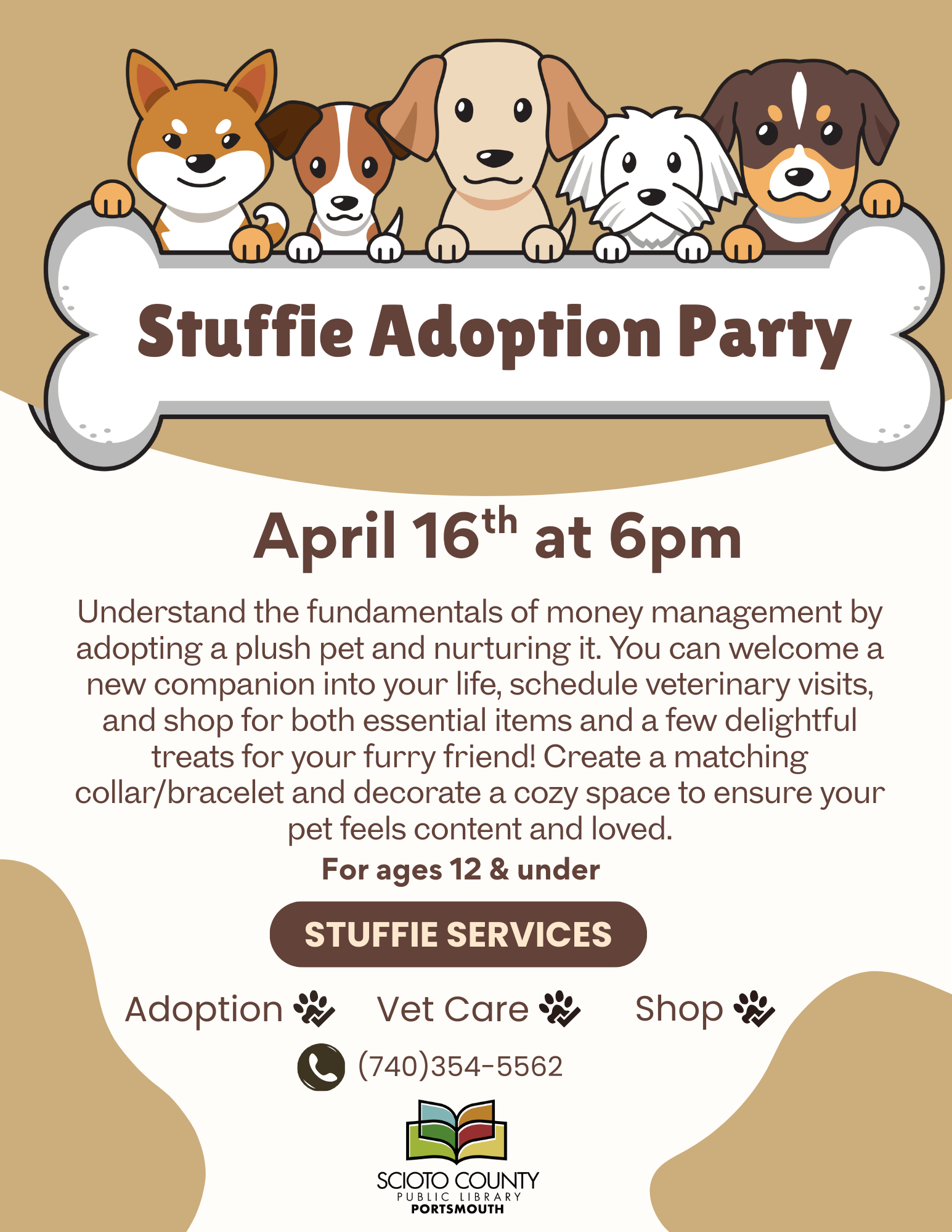Portsmouth Public Library 1220 Gallia Street, Portsmouth, OH, United StatesUnderstand the fundamentals of money management by adopting a plush pet and nurturing it. You can welcome a new companion into your life, schedule veterinary visits, and shop for both essential items and a few delightful treats for your furry friend! Create a matching collar/bracelet and decorate a cozy space...