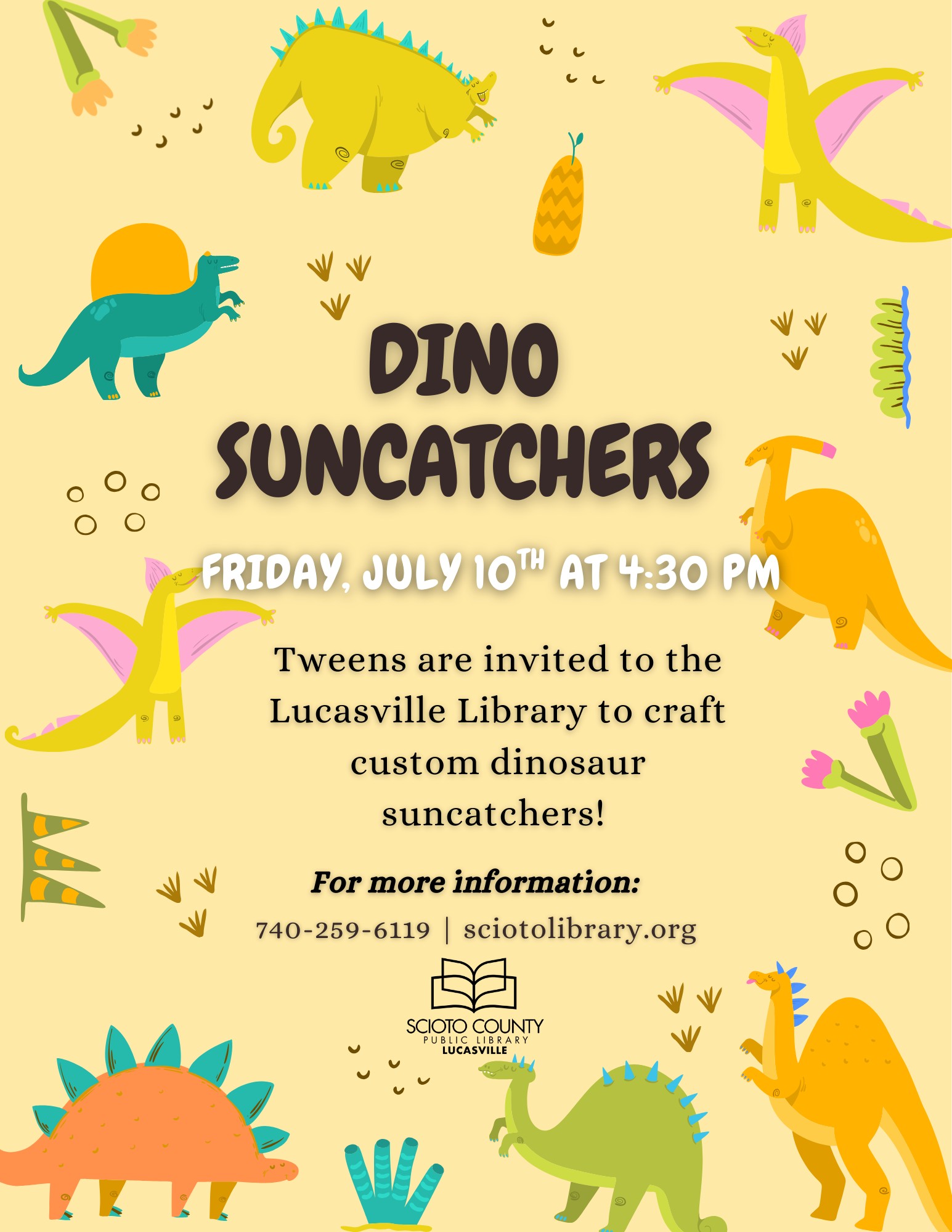 Lucasville Library 103 Lucasville-Minford Rd, Lucasville, OH, United StatesTweens are invited to the Lucasville Library to craft a dinosaur sun catcher! Choose from 8 different dino-types and make it your own, then enjoy how your new creation looks in the summer sun. This program will take place on Friday, July 10th at 4:30 PM. For more information, call...