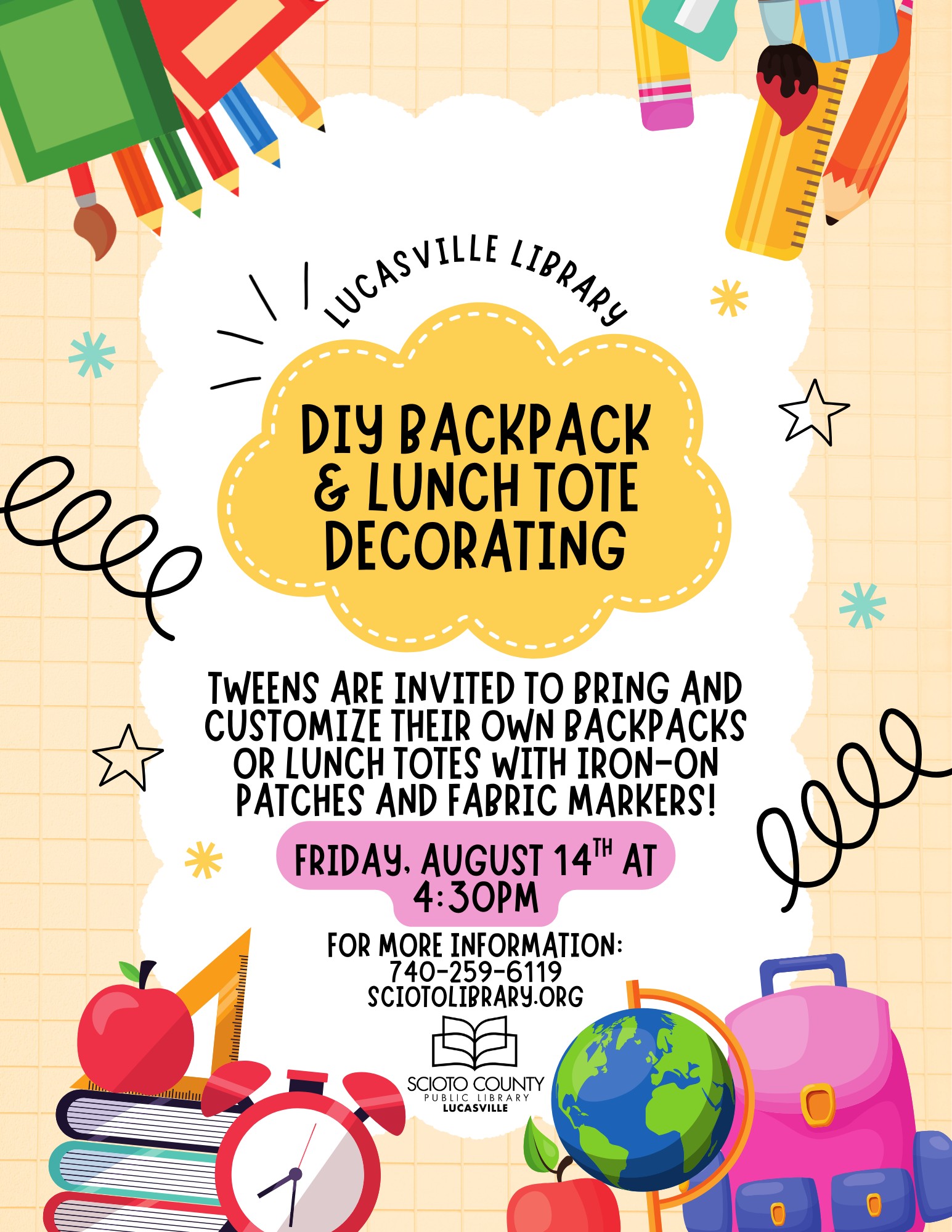 Lucasville Library 103 Lucasville-Minford Rd, Lucasville, OH, United StatesTweens are invited to the Lucasville Library to get ready for the new school year with DIY backpack and lunch bag decorating! Bring your own lunch box or backpack and customize it with iron-on patches and fabric markers. Go back to school in style with your one-of-a-kind creation! This program...