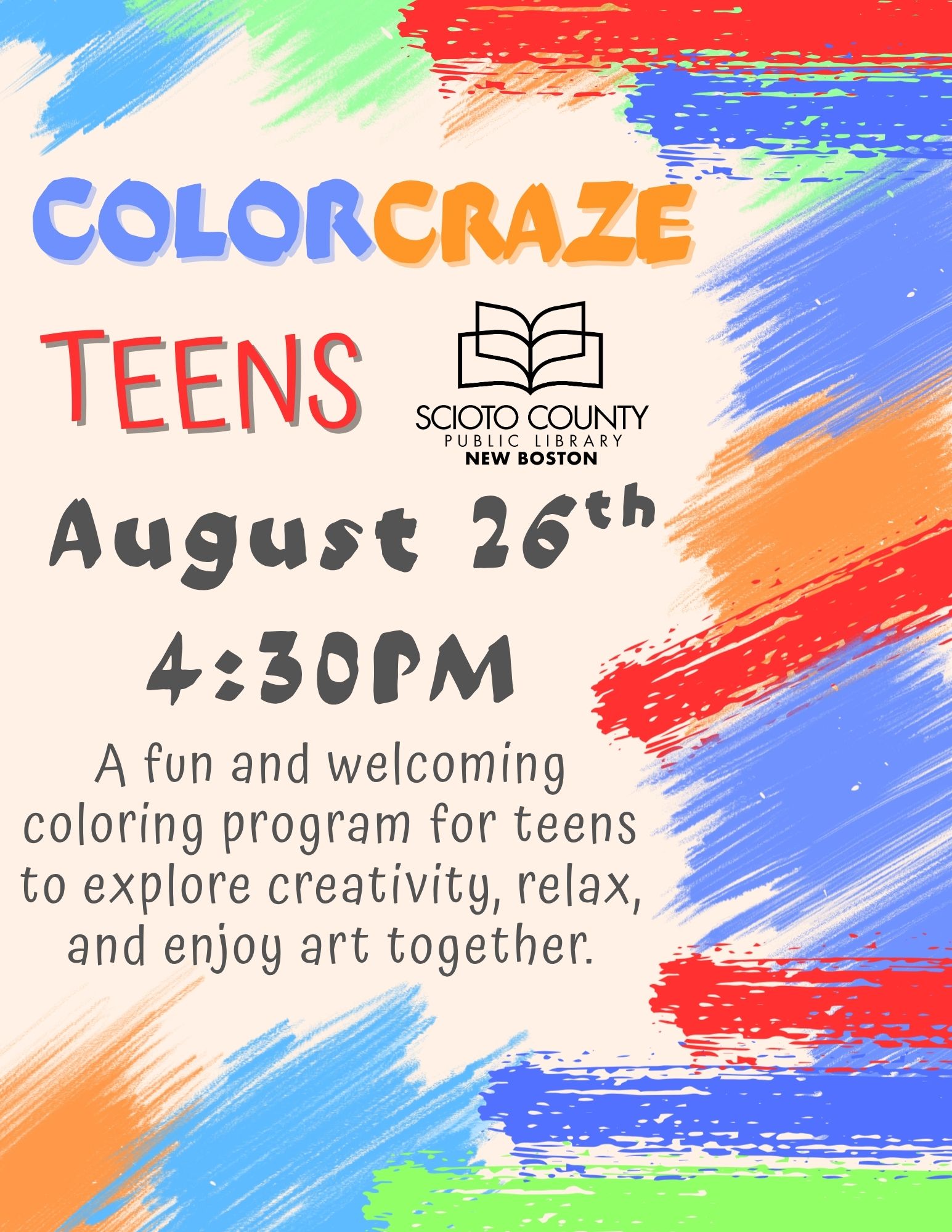 New Boston Library 3850 Rhodes Avenue, New Boston, OH, United StatesA fun and welcoming coloring program for teens to explore creativity, relax, and enjoy art together.