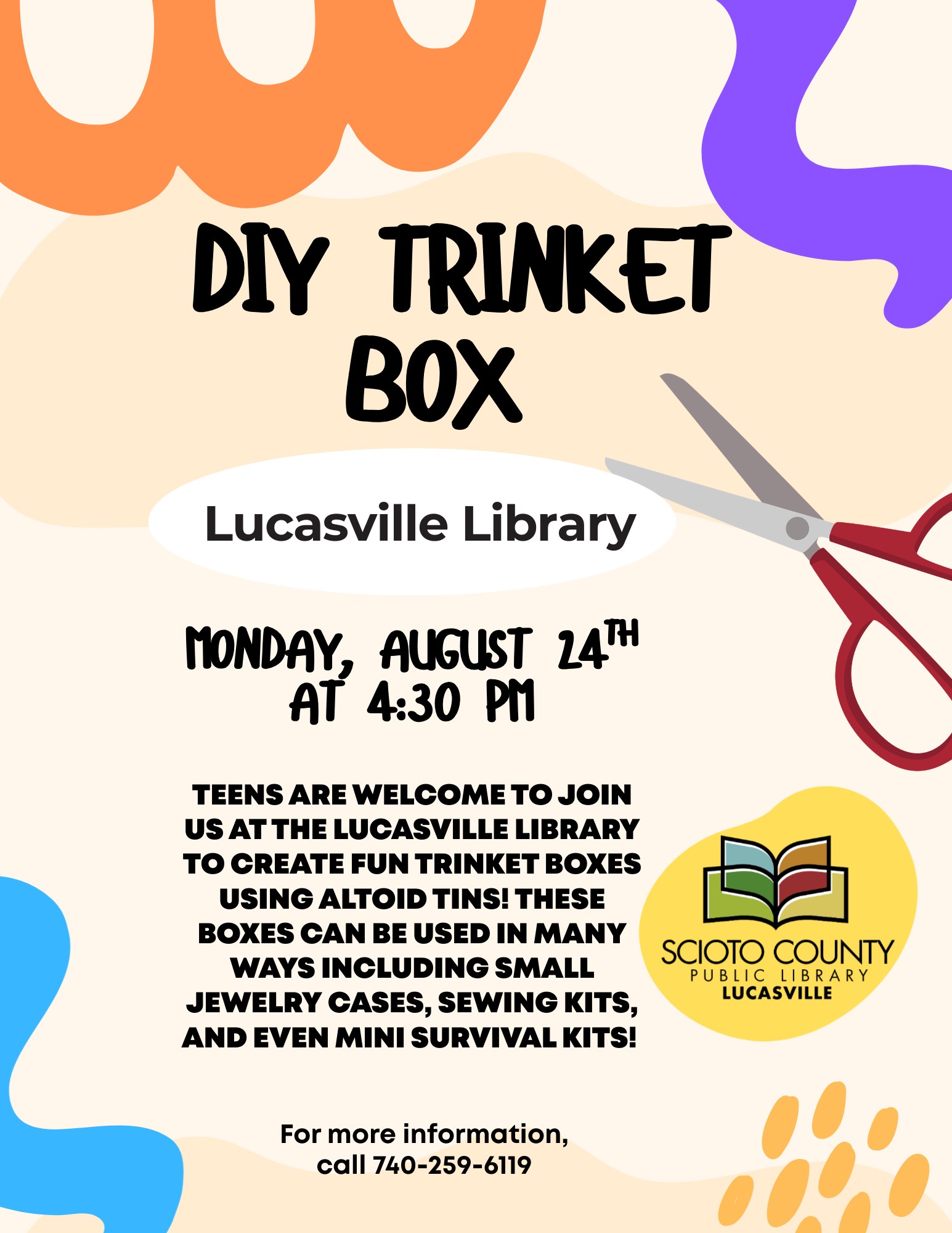 Lucasville Library 103 Lucasville-Minford Rd, Lucasville, OH, United StatesOn Monday, August 24th at 4:30 pm the Lucasville Library will be having a Trinket Box craft activity for teens using Altoid tin cases. We will be decorating and customizing tin boxes that can be used in a variety of ways including small jewelry cases, sewing kits, mini survival kits,...