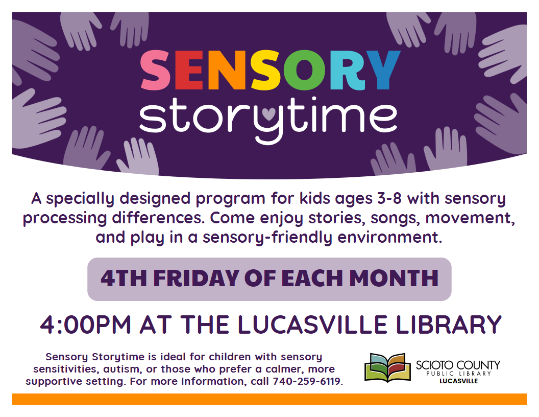Lucasville Library 103 Lucasville-Minford Rd, Lucasville, OH, United StatesKids ages 3-8 are welcome to join us at the Lucasville Library on Friday, August 28th at 4pm for sensory storytime. We will be enjoying stories, songs, movement and play in a sensory friendly environment! For more information, call 740-259-6119.