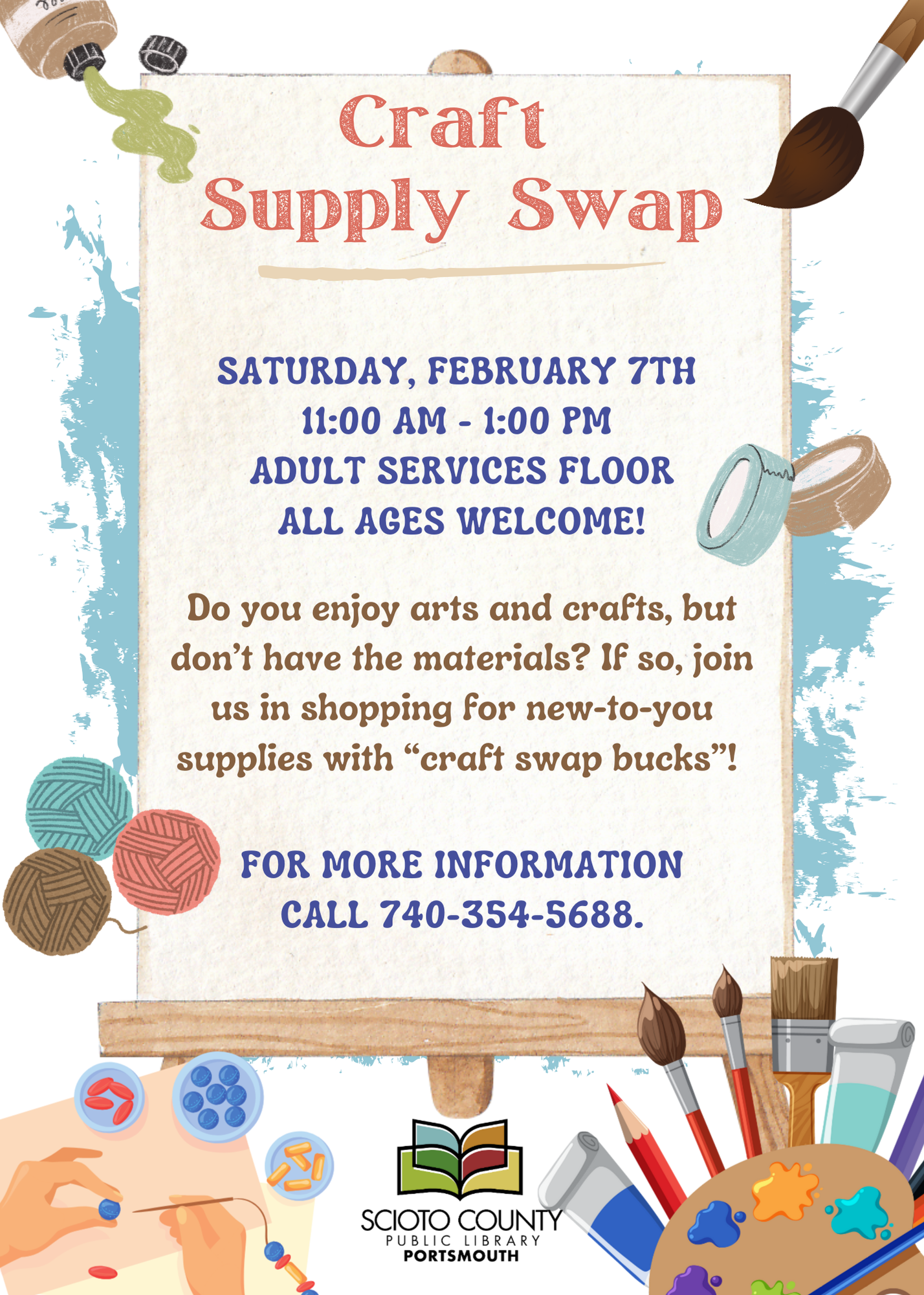 Portsmouth Public Library 1220 Gallia Street, Portsmouth, OH, United StatesDo you enjoy arts and crafts, but don’t have the materials? If so, join us in shopping for new-to-you supplies with “craft swap bucks”!