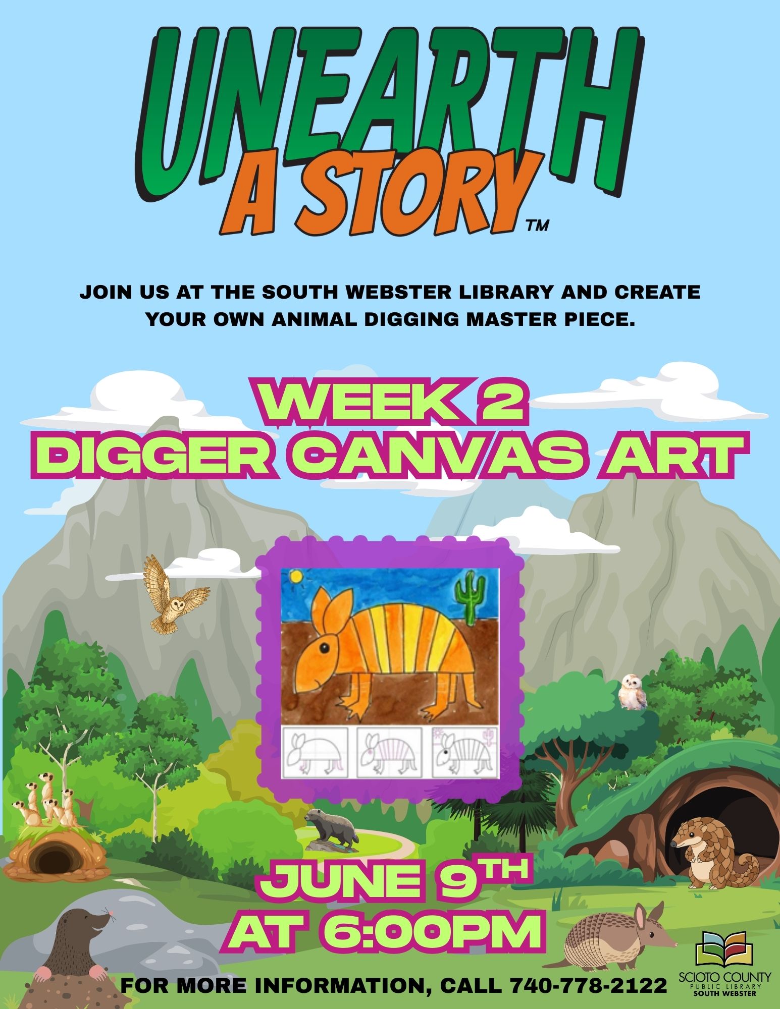 Canvas Digger Art – Join us at the South Webster Library and create your own animal digging master piece. All supplies provided. For more information, call the South Webster Branch Library at 740-778-2122.