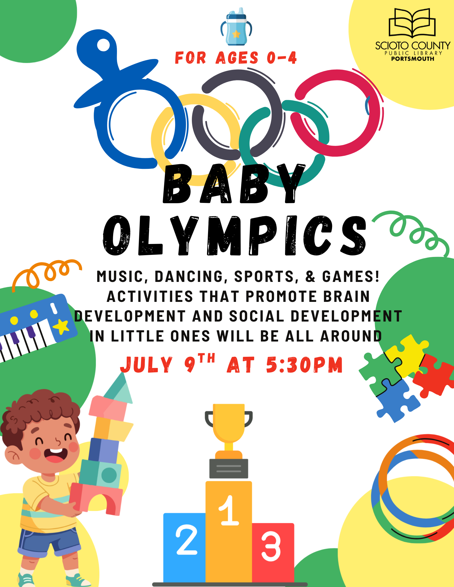 Portsmouth Public Library 1220 Gallia Street, Portsmouth, OH, United StatesMusic, dancing, sports, & games! Activities that promote brain development and social development in little ones will be all around! For ages 0 to 4