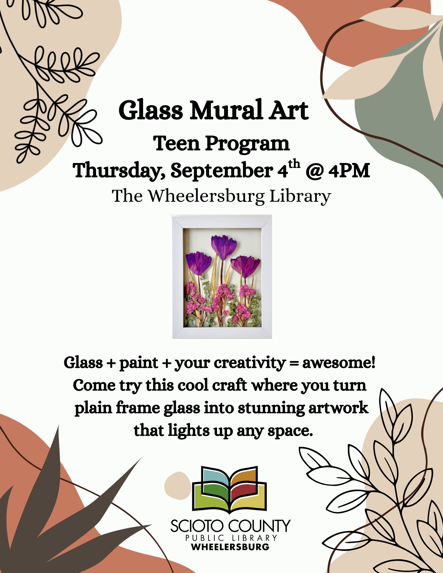 Glass + paint + your creativity = awesome! Come try this cool craft where you turn plain picture frame glass into stunning artwork that lights up any space. All supplies will be provided. If patrons have any questions, they are welcome to call the Wheelersburg Library at (740) 574-6116.