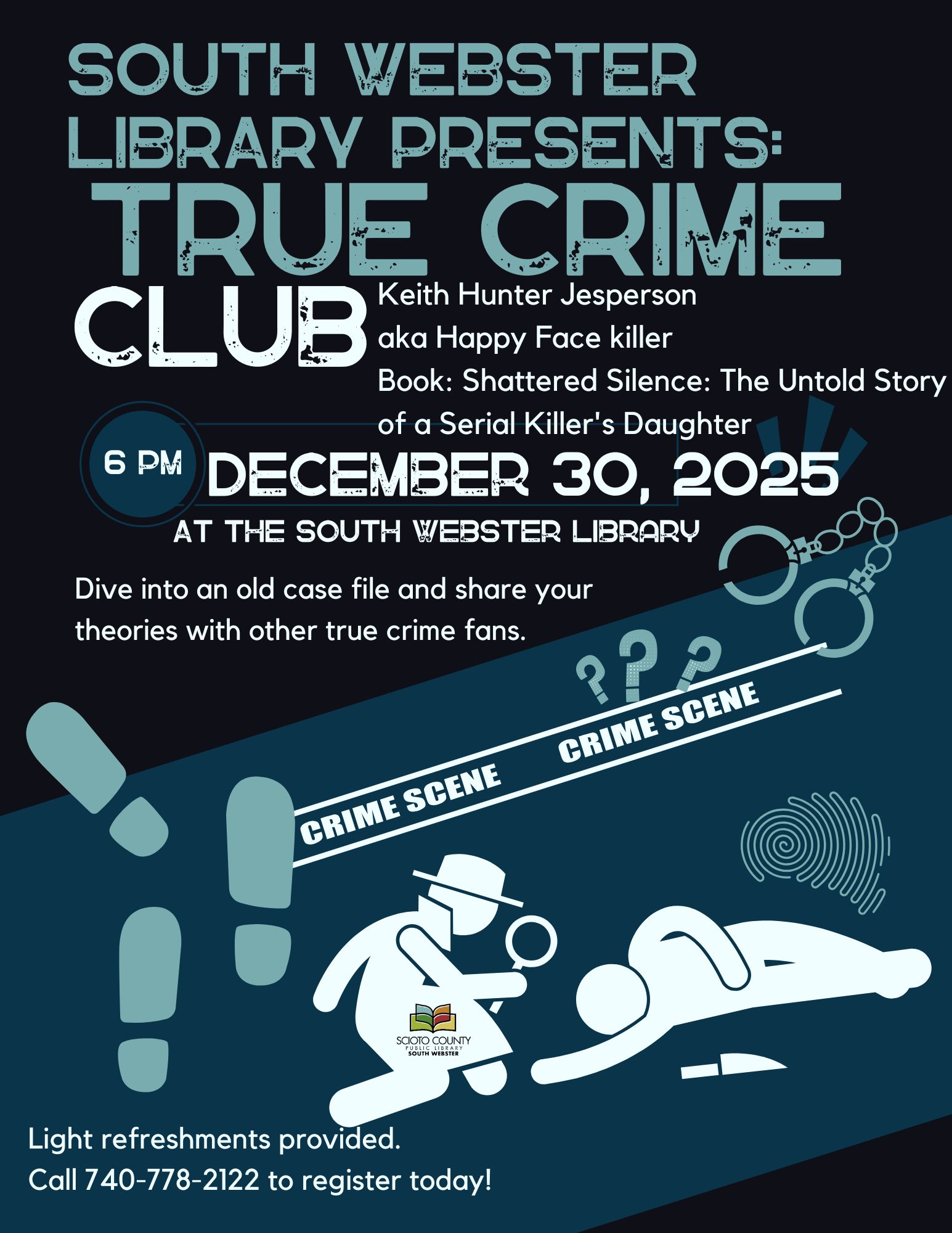 We will be reading the “Shattered Silence: The Untold Story of a Serial Killer’s Daughter” We will focus on this case, give theories, suspects and coverage. Light refreshments will be provided. Registration is required. Open to all Adults. For questions call the South Webster Library at 740-778-2122.