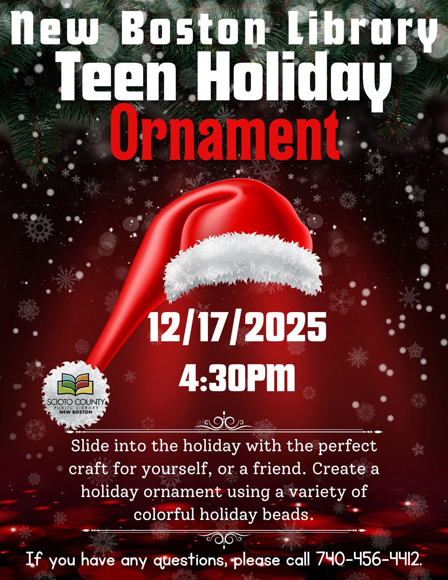 Slide into the holiday with the perfect craft for yourself, or a friend. Create a holiday ornament using a variety of colorful holiday beads at the New Boston Library. For more information, please call 740-456-4412.