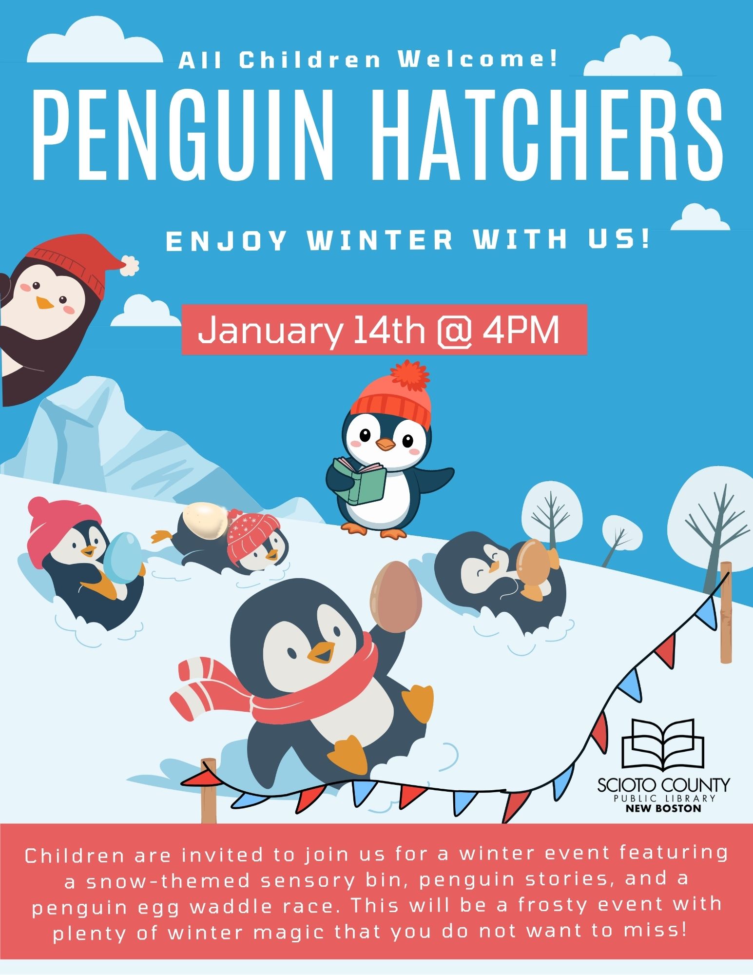 Children are invited to join us for a winter event featuring a snow-themed sensory bin, penguin stories, and a penguin egg waddle race. This will be a frosty event with plenty of winter magic that you do not want to miss!