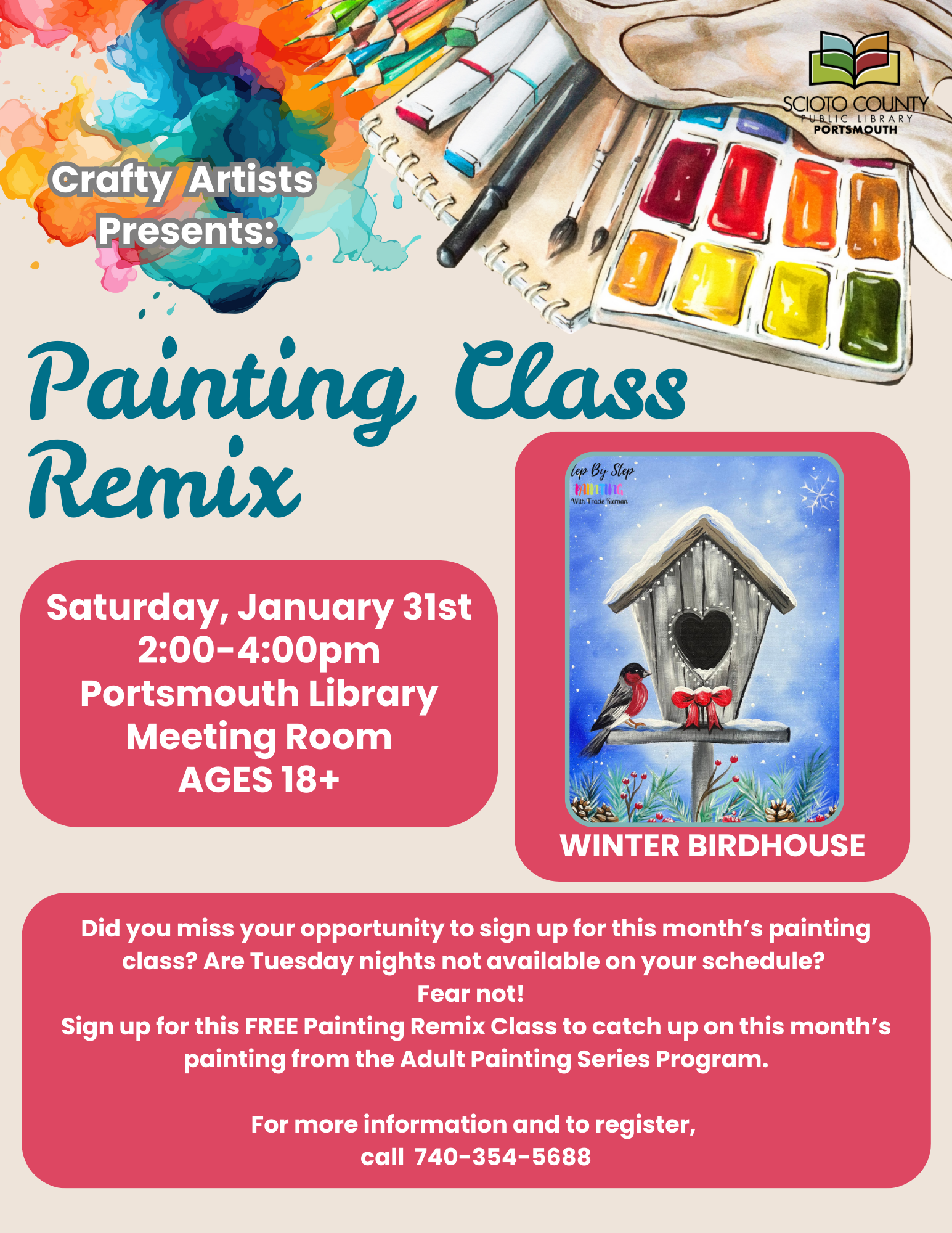 Did you miss January's Adult Painting Class? Or do Tuesday nights not work for your schedule. Join us for another chance to paint a beautiful winter birdhouse. Registration Required.