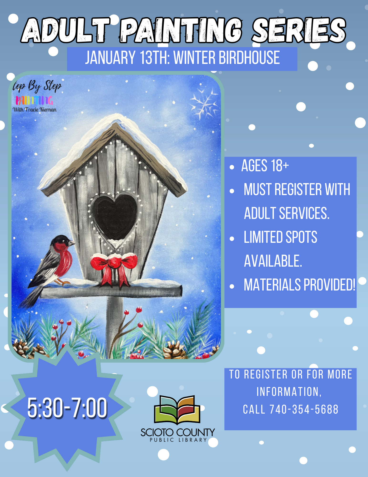 Join us to paint a beautiful winter scene with a birdhouse in the snow. Registration is required. All supplies are provided. 5:30pm in the Meeting Room.