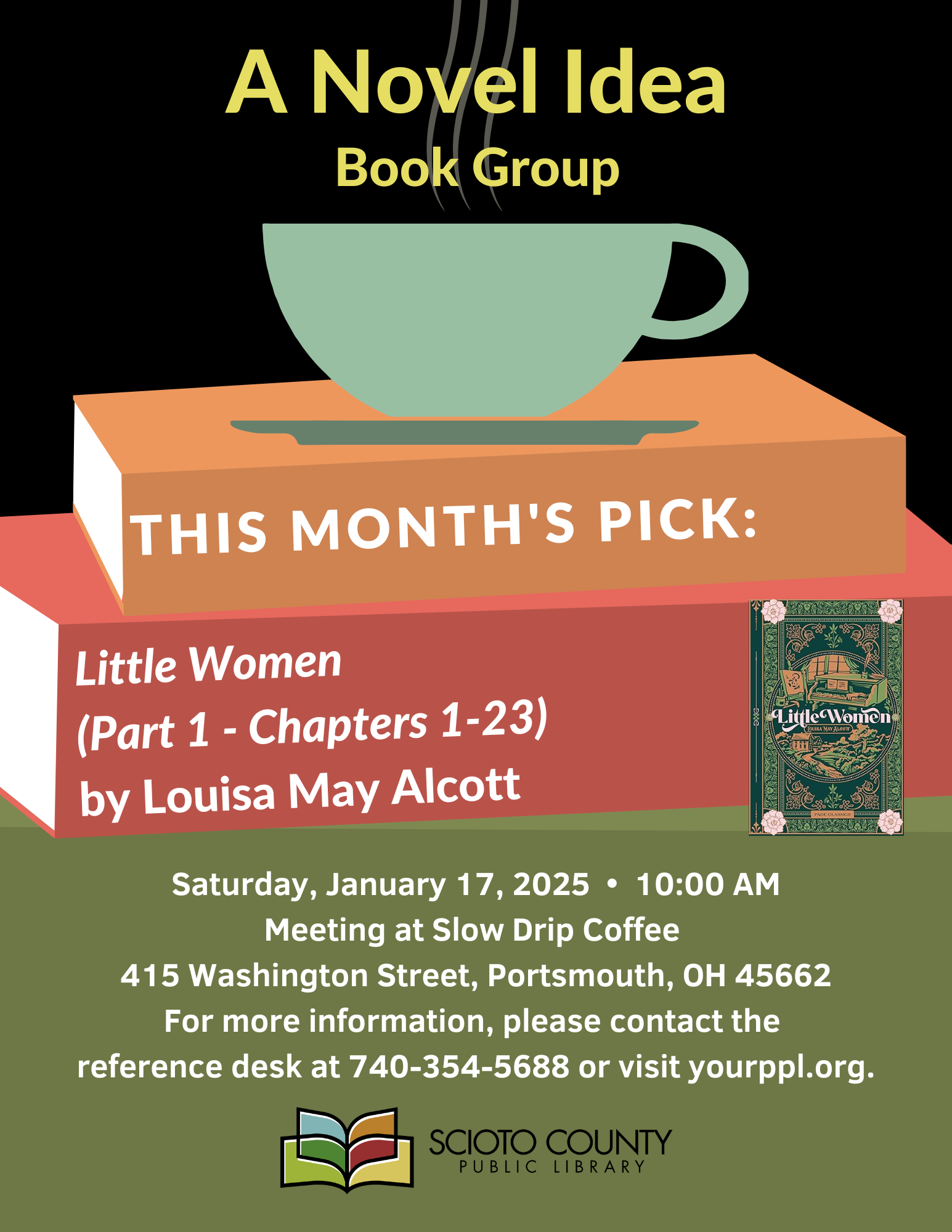 Free reading event. A Novel Idea Book Group meets monthly at Slow Drip Coffee. For more information call 740-354-5688 or visit yourppl.org. Book Selection: Little Women (chapters 1-23) by Louisa May Alcott.