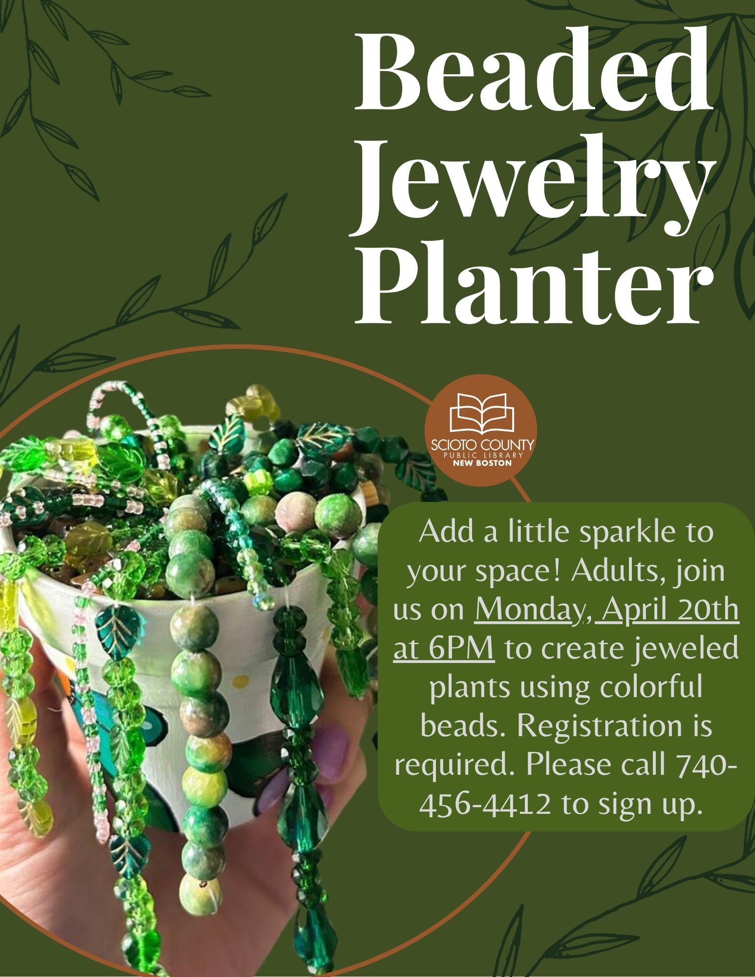 New Boston Library 3850 Rhodes Avenue, New Boston, OH, United StatesAdd a little sparkle to your space! Adults, join us to create jeweled plants using colorful beads. Registration is required for this program. 740-456-4412