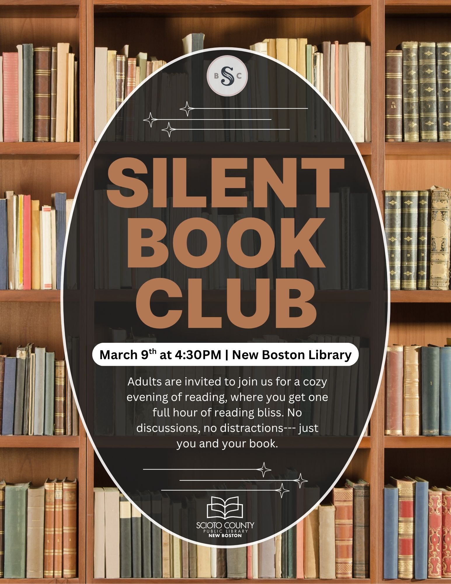 New Boston Library 3850 Rhodes Avenue, New Boston, OH, United StatesAdults are invited to join us for a silent evening of reading, where you get one full hour of pure reading bliss. No discussions, no distractions—just you and your book.
