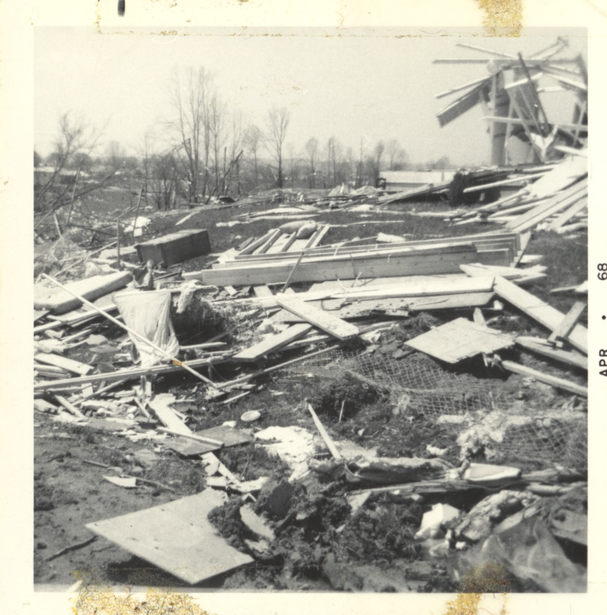 Black and white photo image of destroyed structures after the tornado hit in Wheelersburg. -
