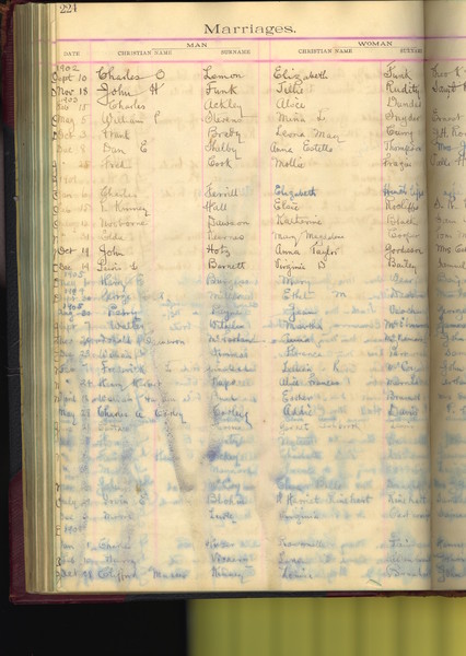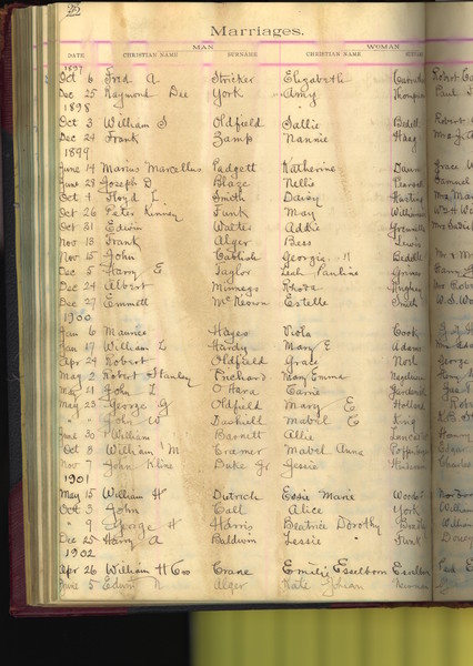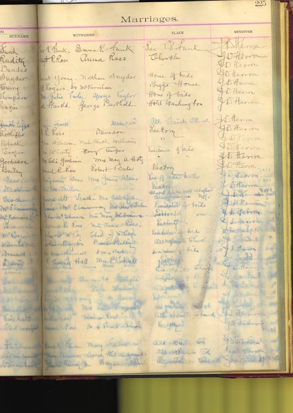 scan of page from All Saints Church Ledger. Shown is typed title at top of page "marriages" with handwritten names, dates, witnesses, and place of marriage listed beneath.
