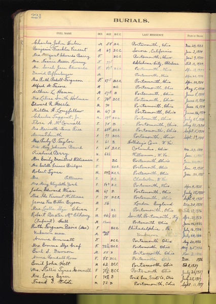 scan of page from All Saints Church Ledger. Shown is typed title at top of page "burials" with handwritten information listed in rows beneath.