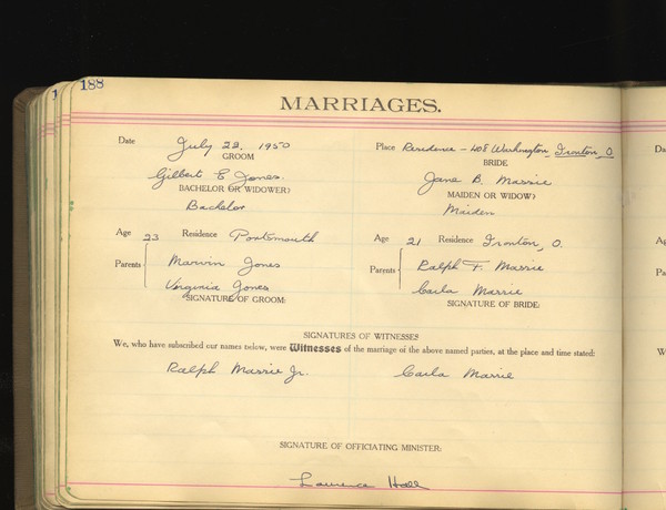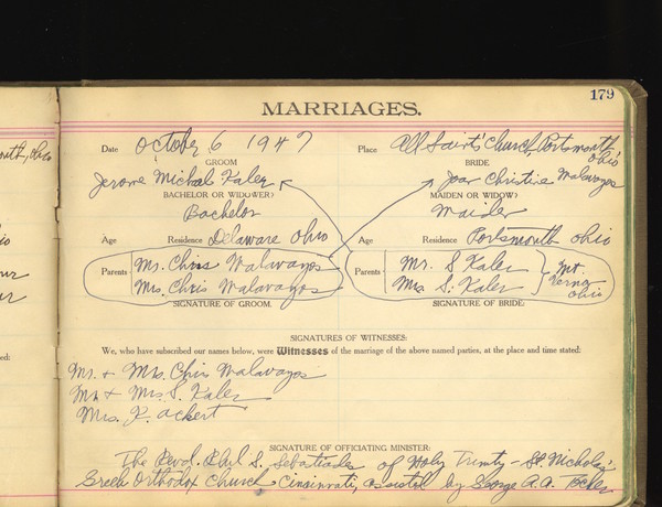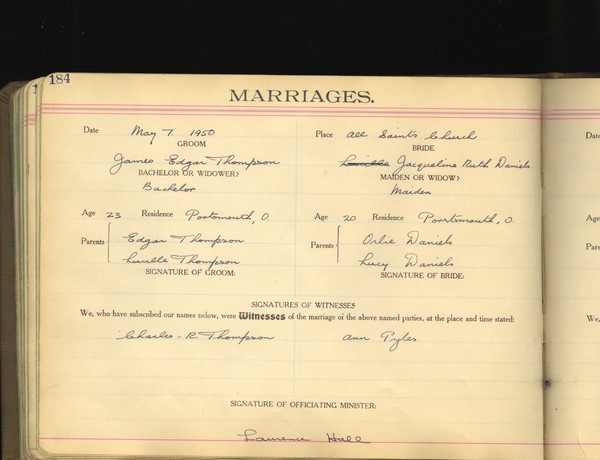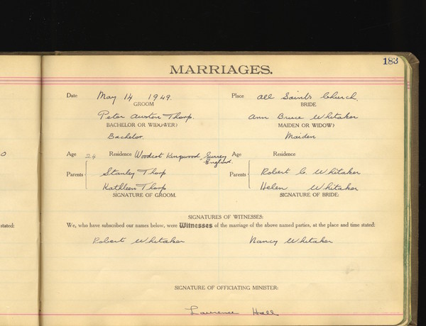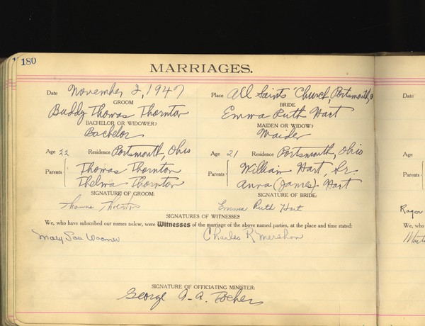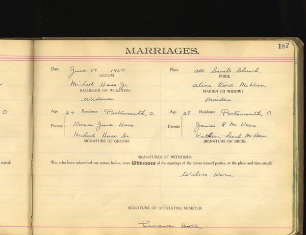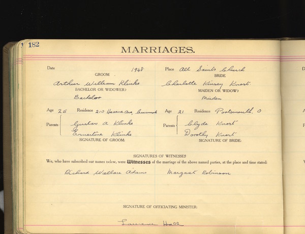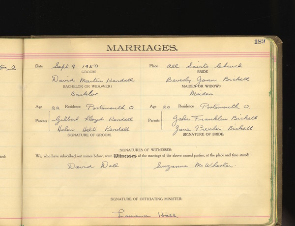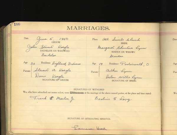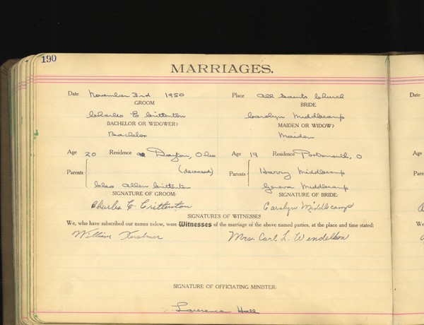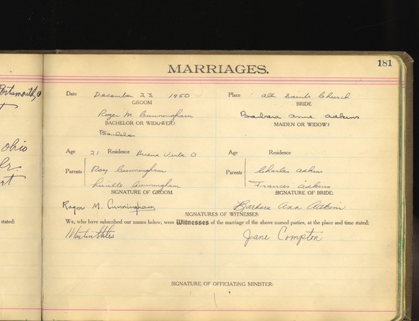 scan of page from All Saints Church Ledger. Shown is typed title at top of page "marriages" with handwritten information listed beneath.