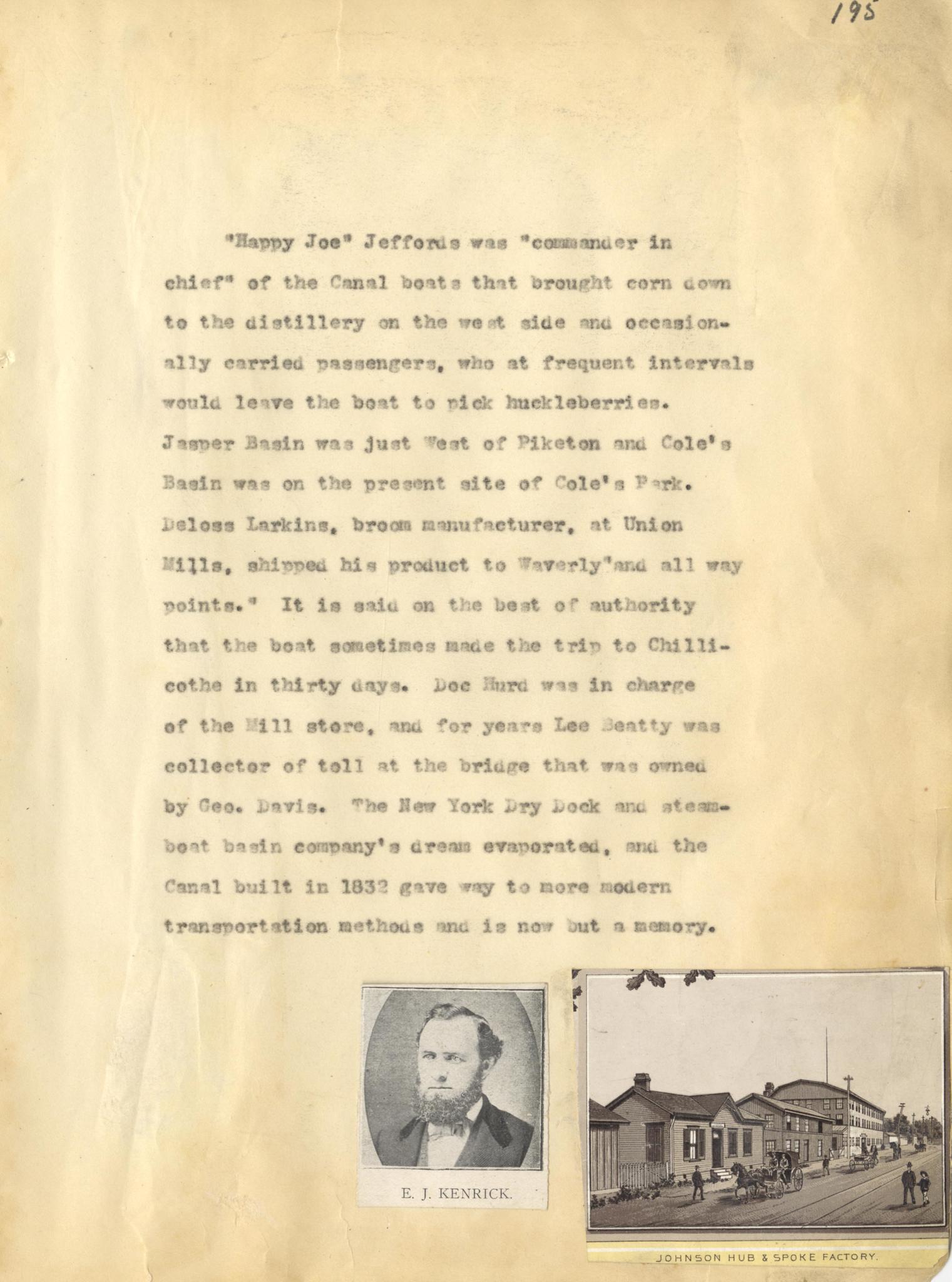 Photo image of scanned scrapbook page 195. Shown is a typed page detailing events in the life of "Happy Joe" Jeffords, "Commander in Chief" of the Canal boats that brought corn to the distillery on the west side. Cole's Park; Deloss Larkins; Union Mills; Doc Hurd; New York Dry Dock and Steamboat Company; canal.