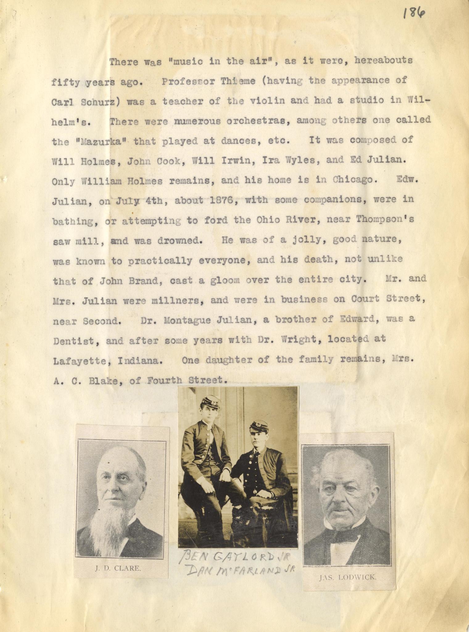 Photo image of scanned scrapbook page. Pictured is typed page giving details about musical groups in Portsmouth. Professor Thime, violin teacher with a studio at Wilhelm's; "Mazurka;" Will Holmes; John Cook; Will Irwin; Ira Wyles; Edward Julian; Ohio River; Thompson's Saw Mill; John Brand; Dr. Montague Julian, dentist; Dr. Wright; Mrs. A. C. Blake.