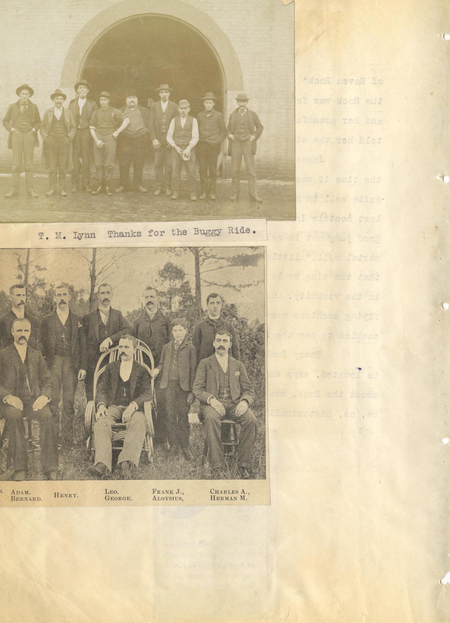 Photo image of scanned scrapbook page.Black and white photo with the caption "T. M. Lynn Thanks for the Buggy Ride." Below is a black and white with names beneath: Adam Bernard, Henry, Leo George, Frank L. Aloysius, Charles A., Herman M.