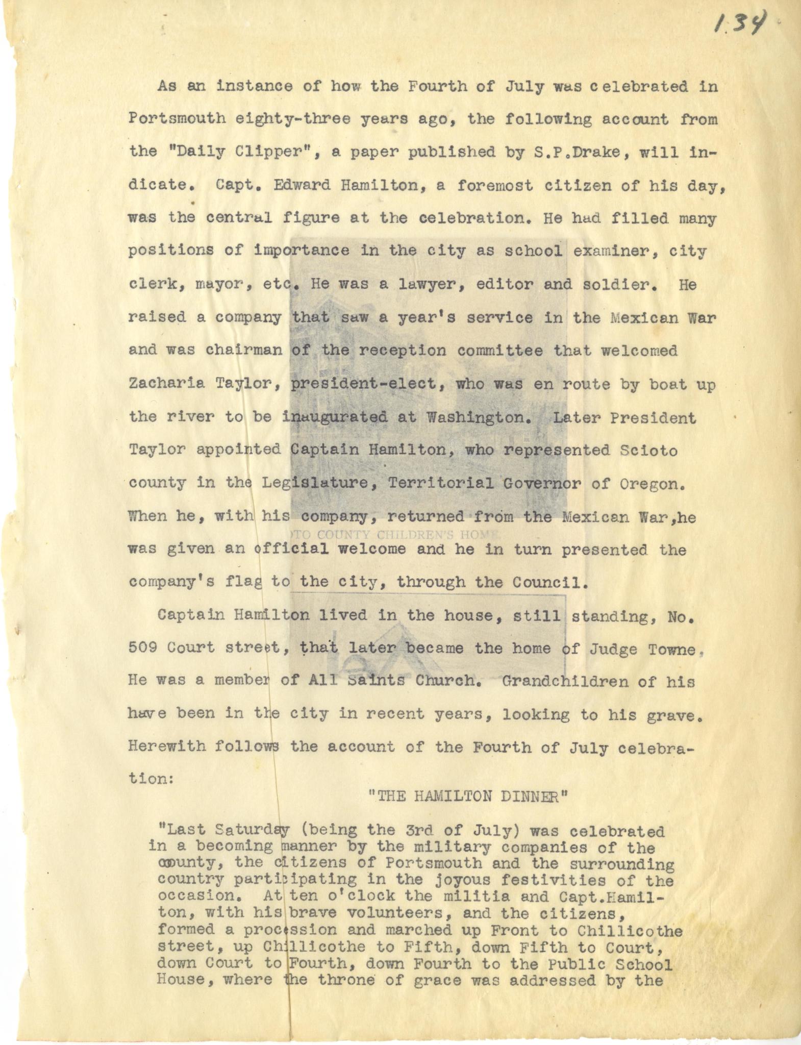 Photo image of scanned scrapbook page. Pictured: "Daily Clipper" Account of the July Fourth Celebration conducted by Captain Edward Hamilton; S. P. Drake; Captain Edward Hamilton; Zacharia Taylor; Captain Hamilton; City Council; "The Hamilton Dinner;" Procession on Front and Chillicothe Streets