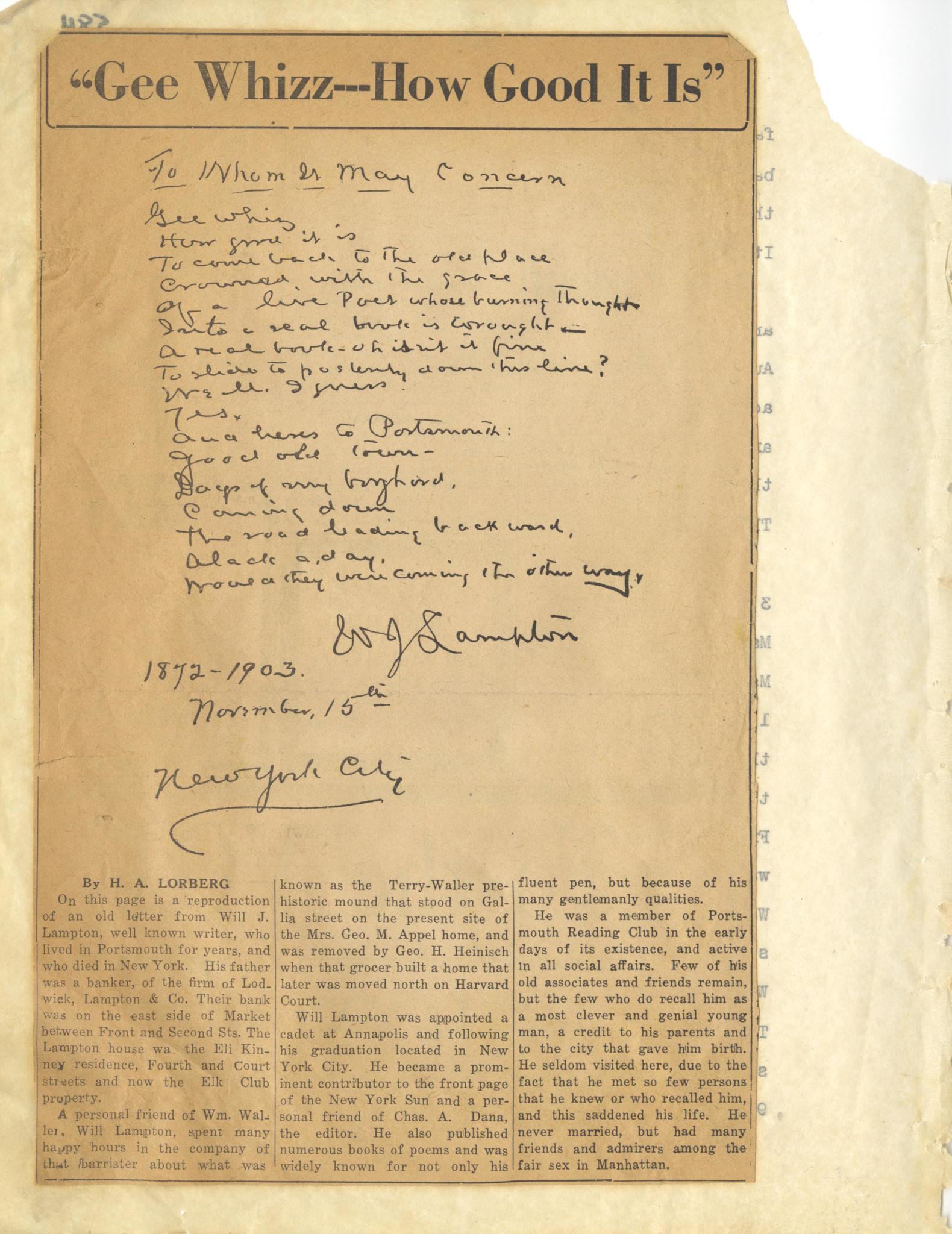 Photo image of scanned scrapbook page. Pictured: "Gee Whizz- How Good It Is" article by H. A. Lorberg. Will J. Lampton; Lampton & Company bank; Eli Kinney Residence; Elk Club; William Waller; Terry-Waller Mound; Mrs. George M. Appel; George H. Heinisch; Portsmouth Reading Club