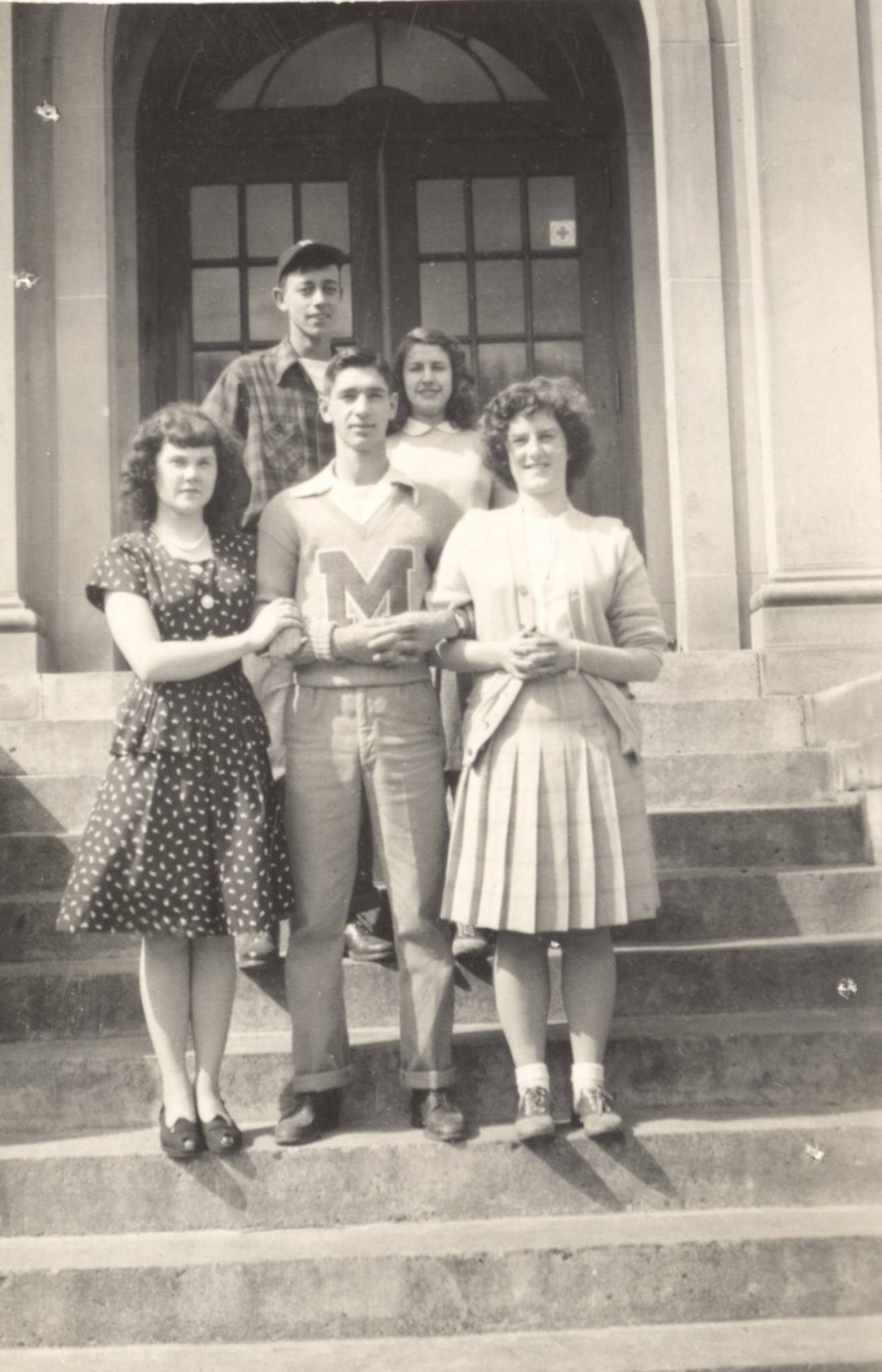 Black and white photo image of members of the McDermott Class of 1947. Pictured: Back row: Wayne Lamonda and Marilyn Jean Davis. Front row: Ruth Ann Brannan, Jake Miller, and Betty Walker.