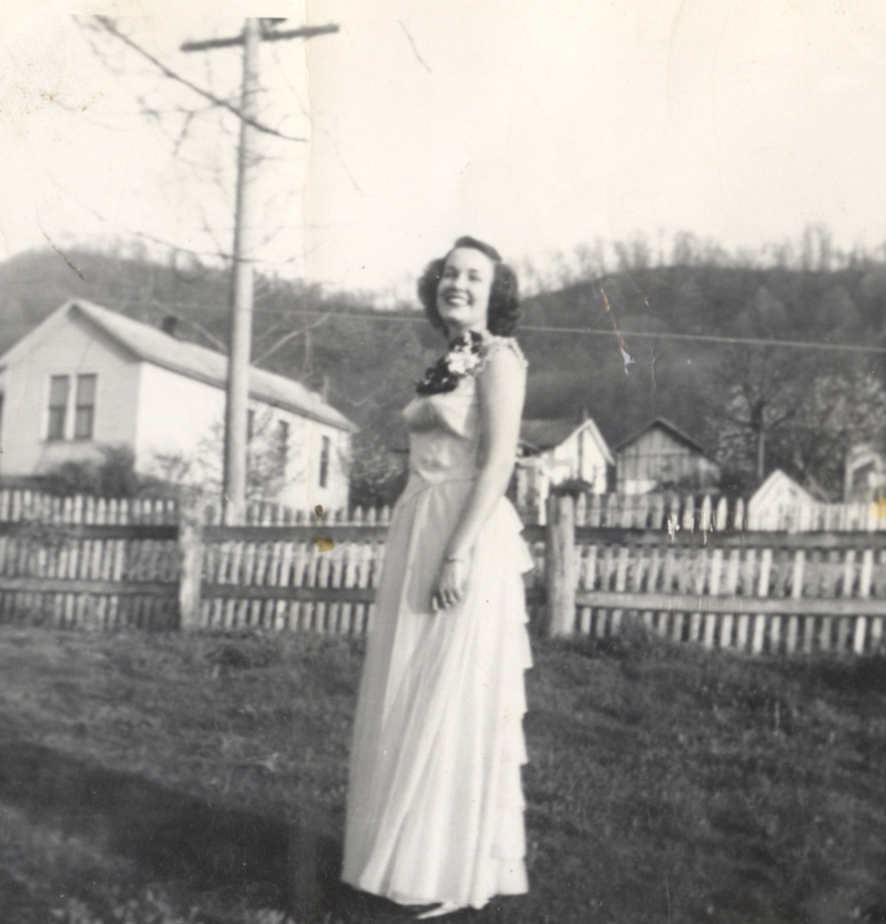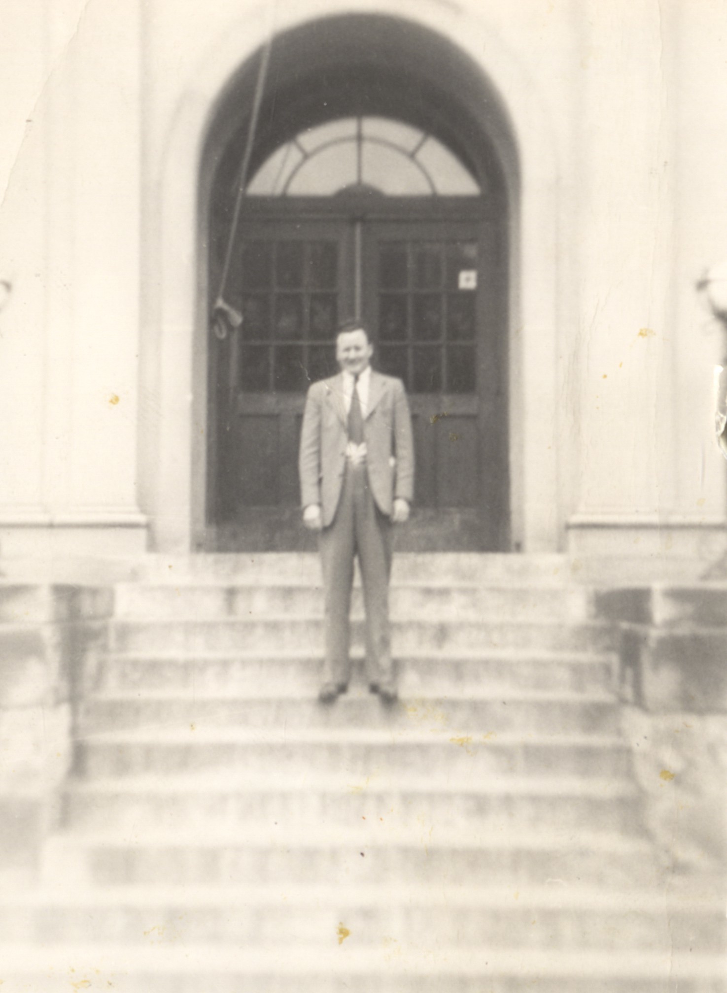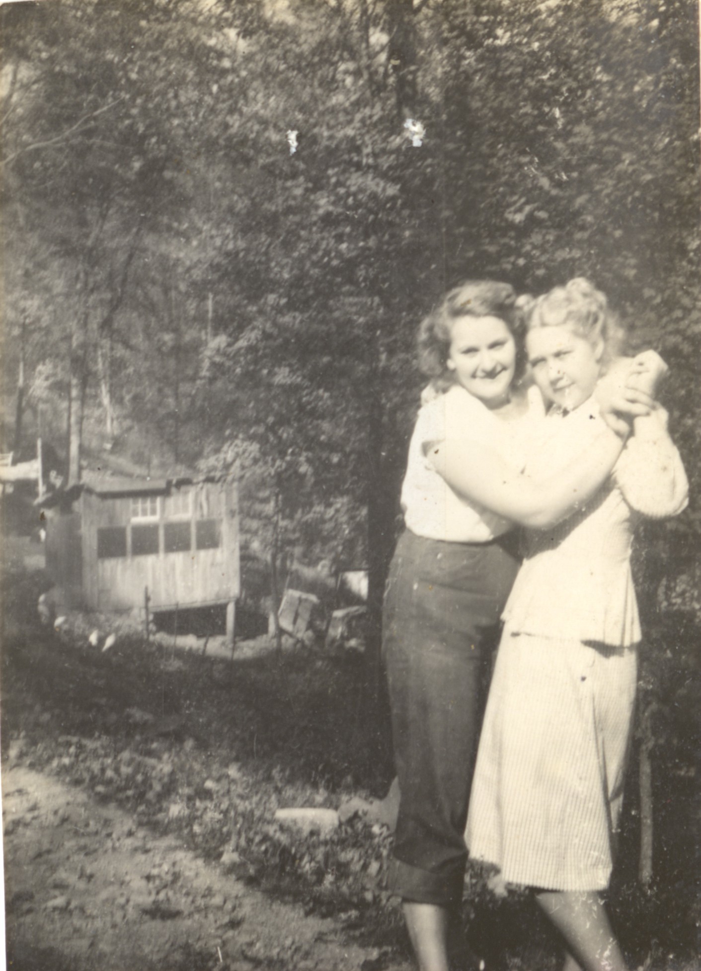 Black and white photo image of Sara Margaret Jones and Ruth Ann Brannan of the McDermott Class of 1947. Here, the are pictured embracing on the front steps of the High School.