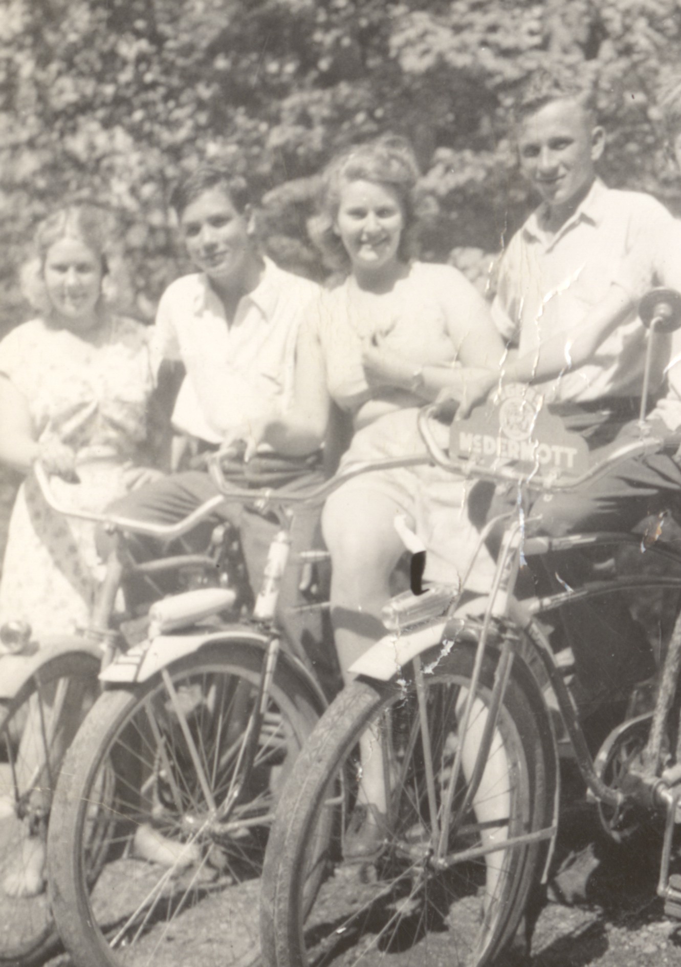 Colorized photo image of the 50th Reunion of the McDermott Class of 1947 on July 25, 1997. Pictured from left to right: Meg Scott, Jake Miller, Janet Franklin, Wayne Lanonda, and Geneva Nelson.