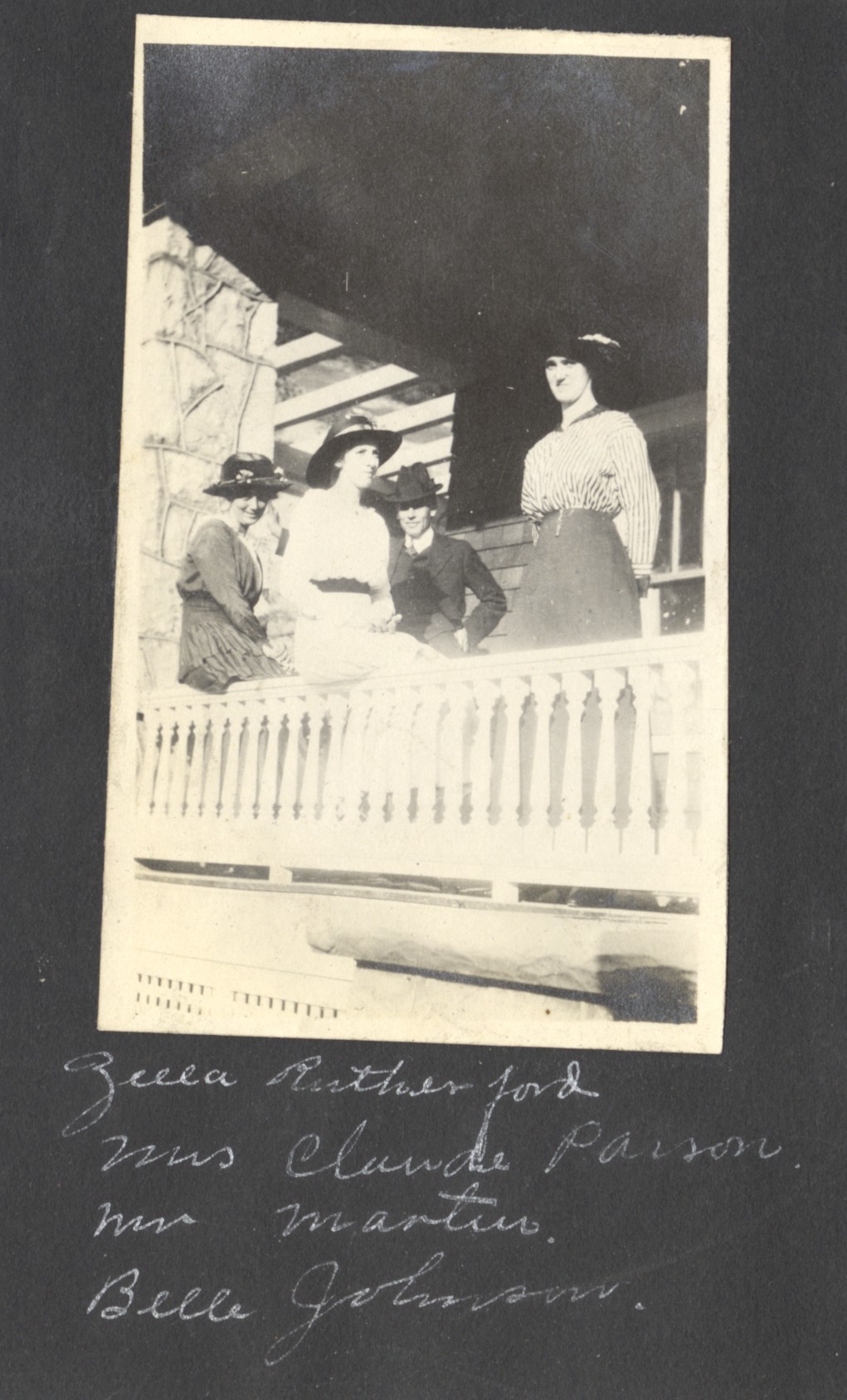 Black and white photo of Zella Rutherford, Mrs. Claude Parson, Mr. Martin, and Belle Johnson