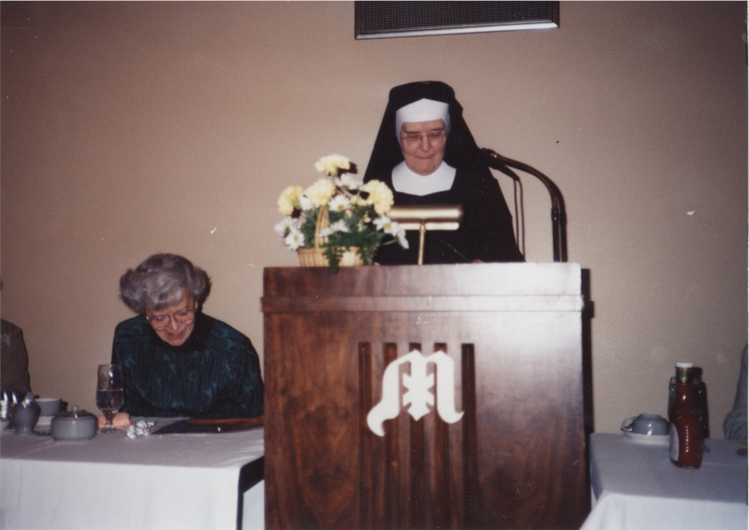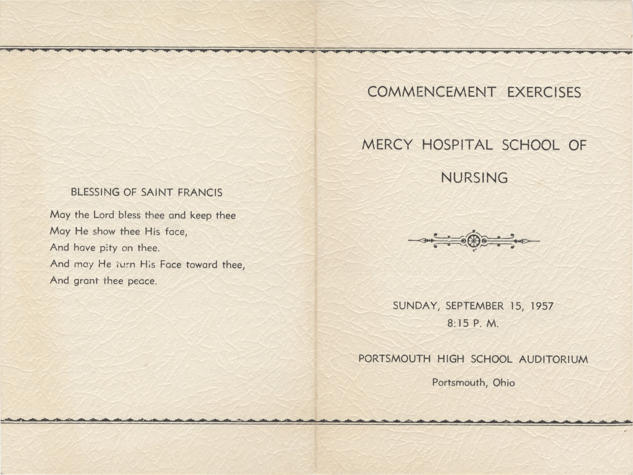 Tan cardstock with brown fonts and illustration. Commencement Exercises of the Mercy Hospital School of Nursing with program and list of class of 1957 inside.