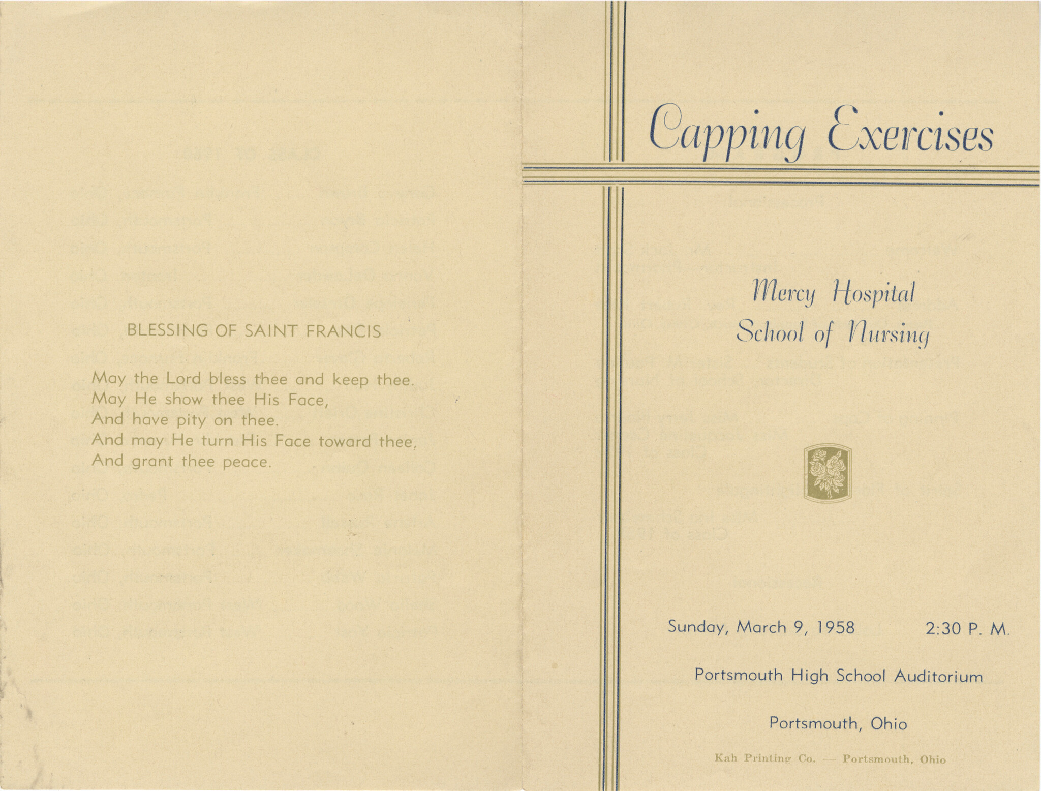 Tan paper pamphlet with blue print of the Mercy Hospital School of Nursing Capping Exercises. Inside information on the program and student list of 1960.