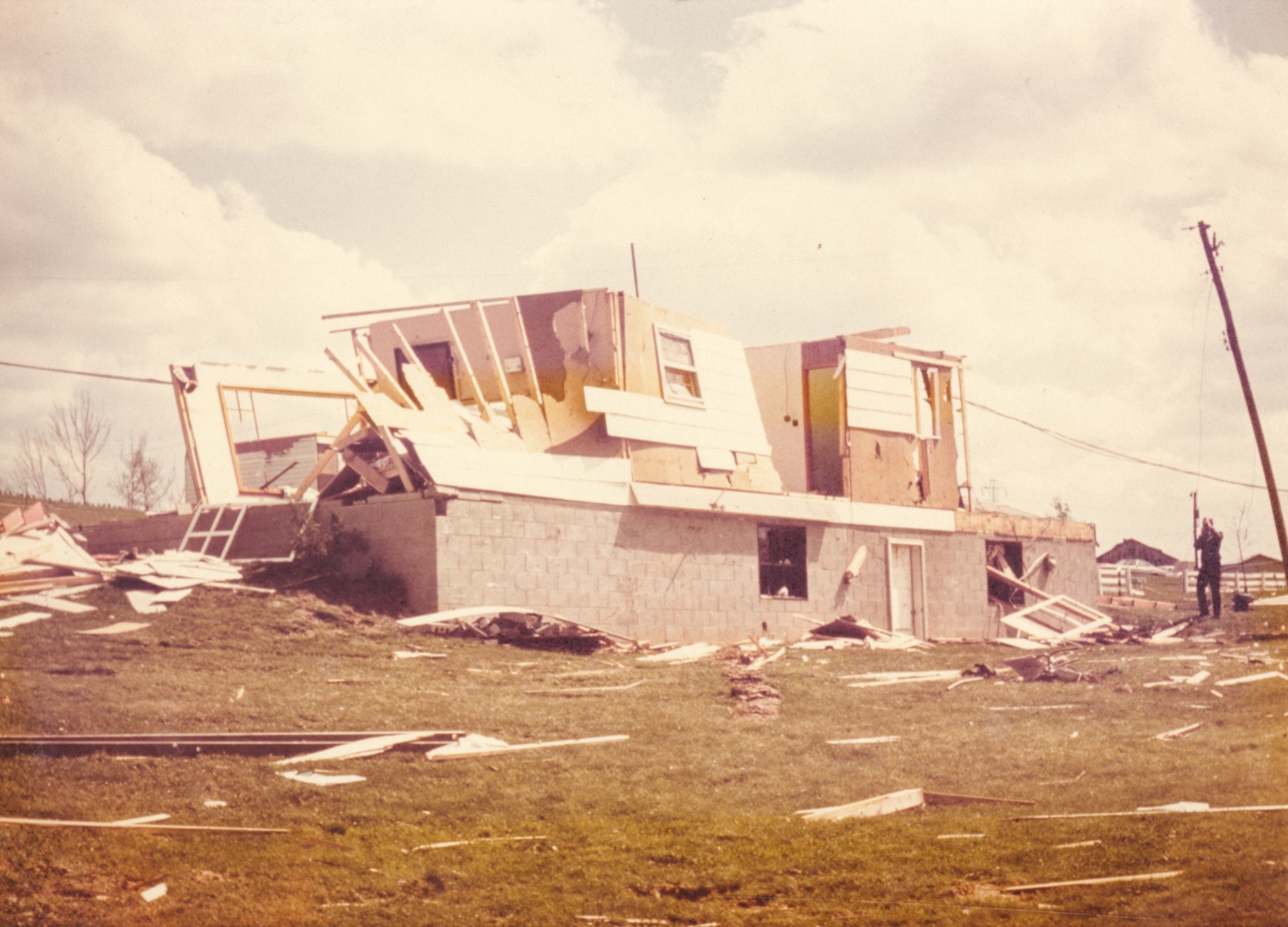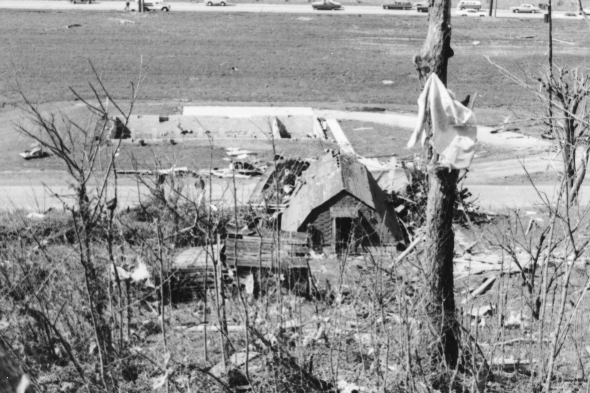 Black and white photo image of Bell Hill after the tornado. The entire area was stripped of trees.