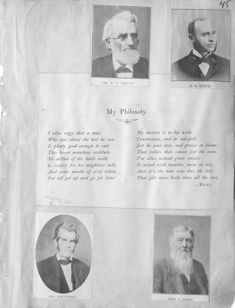 Scanned unnumbered page from Henry A. Lorberg scrapbook containing black & white images of William Werts; Joshua Wheeler; and The Lutz Family. A Putt's Overland Envelope is attached at the bottom.